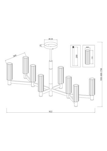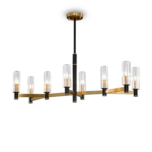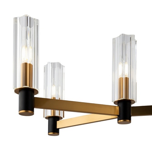 Арматура из металла сочетает два оттенка: черный и латунь. Плафоны цилиндрической формы выполнены из рельефного прозрачного стекла. Актуальная геометрия с настроением американской классики. Источник света – лампа с цоколем E14.