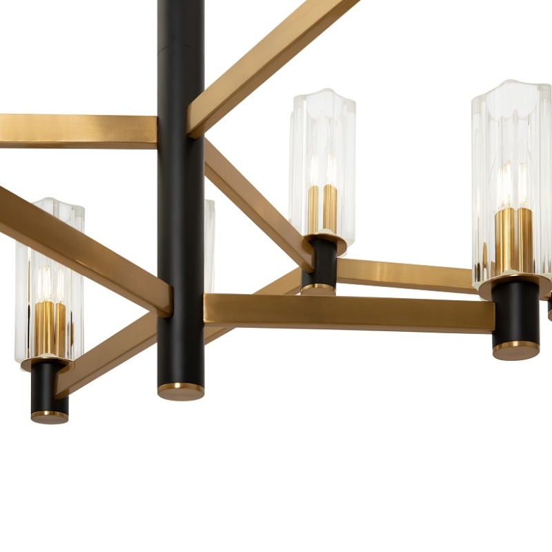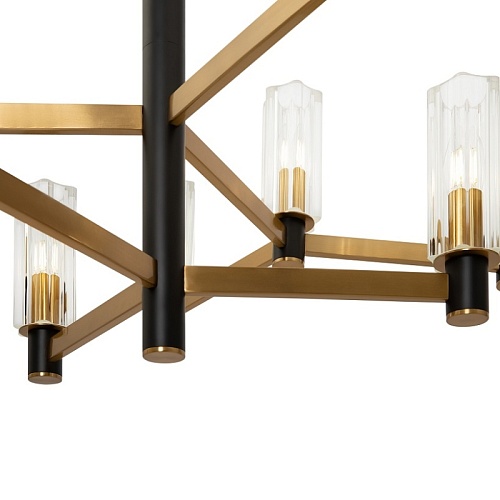 Арматура из металла сочетает два оттенка: черный и латунь. Плафоны цилиндрической формы выполнены из рельефного прозрачного стекла. Актуальная геометрия с настроением американской классики. Источник света – лампа с цоколем E14.