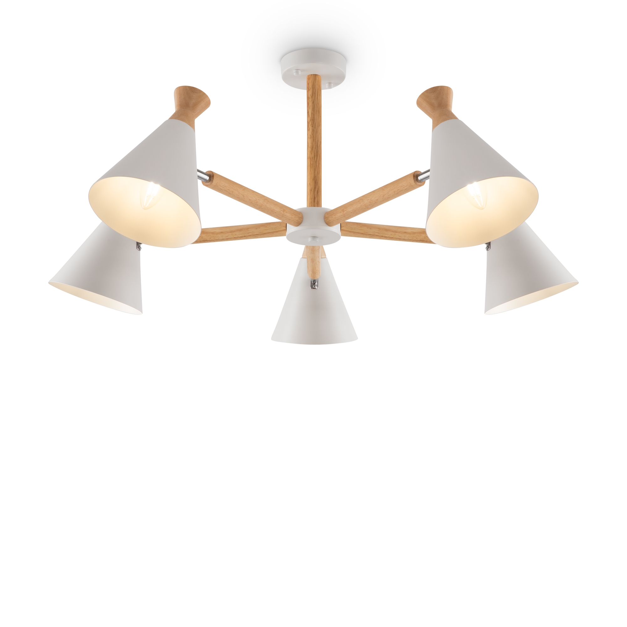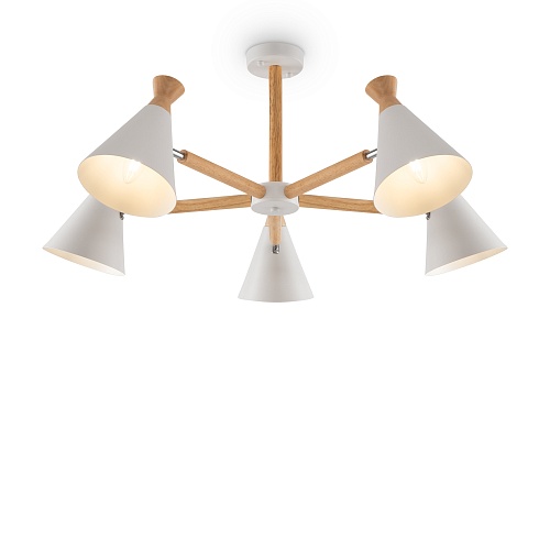 Арматура и плафоны из металла в белом цвете. Декоративные элементы из натурального дерева. Поворотные плафоны для регулировки светового потока. Источник света – лампа с цоколем E14.