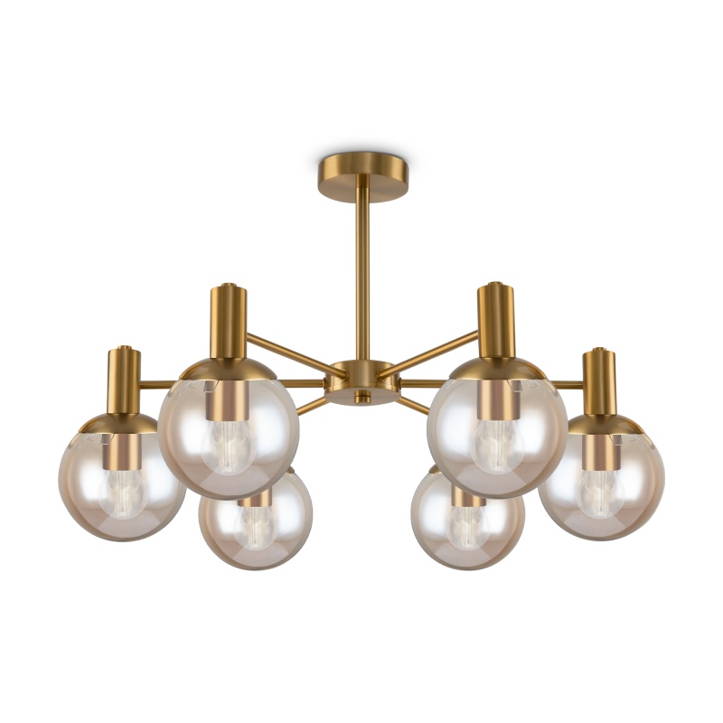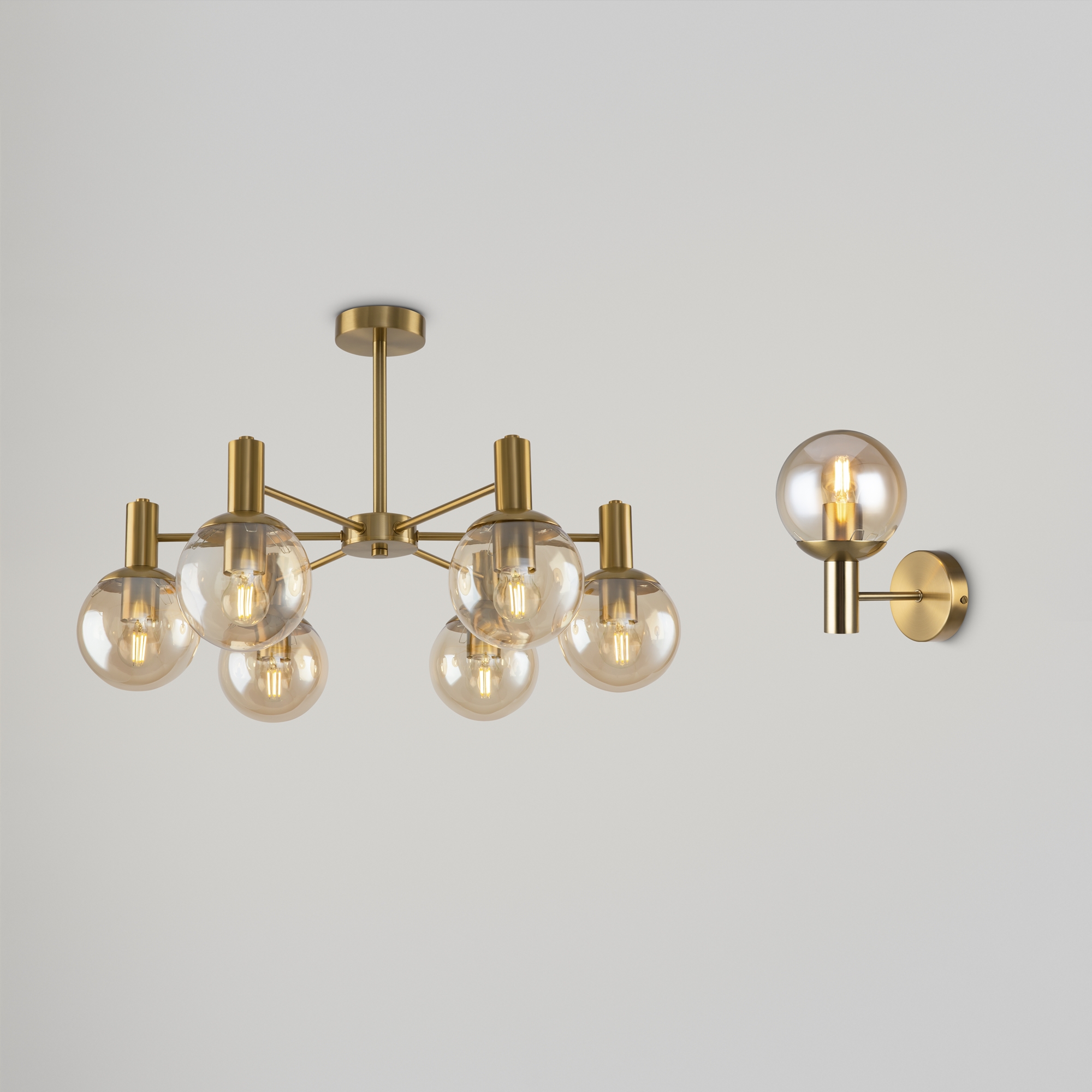 Брутальная романтика лофта и сдержанность минимализма объединились в дизайне серии Globo. Металлическая арматура окрашена в цвет латуни. Её строгая геометрия разбавлена округлыми плафонами-сферами. Выполненные из полупрозрачного стекла и гальванизированные в цвет шампань, они беспрепятственно пропускают свет, обеспечивая яркую направленную подсветку. Потолочные светильники серии – люстры, рассчитанные на 6 и 8 плафонов – отлично подойдут для стандартных потолков. Также в серии представлено бра для зональной подсветки. Светильники будут выигрышно смотреться в интерьерах, оформленных в стиле лофт, минимализм, сканди.