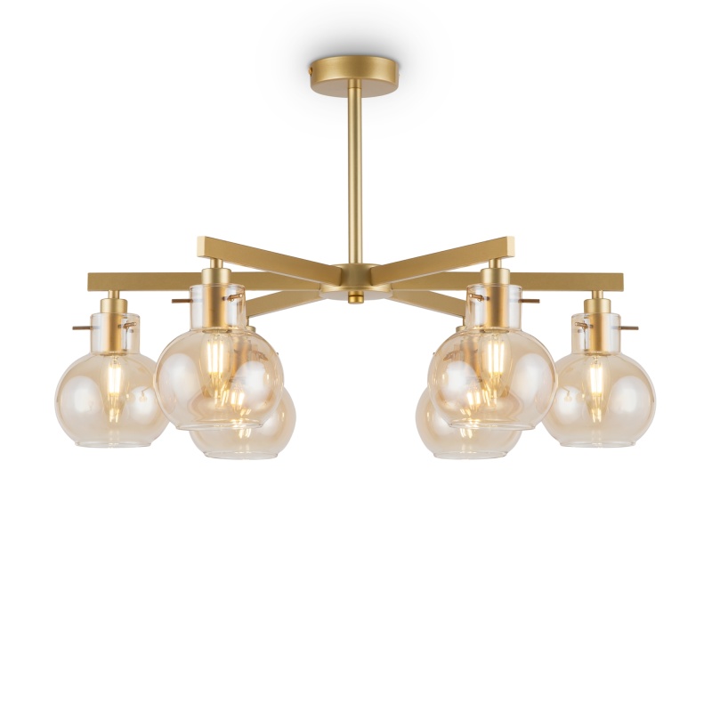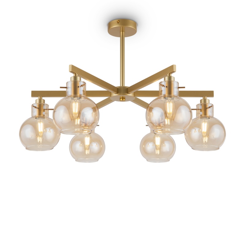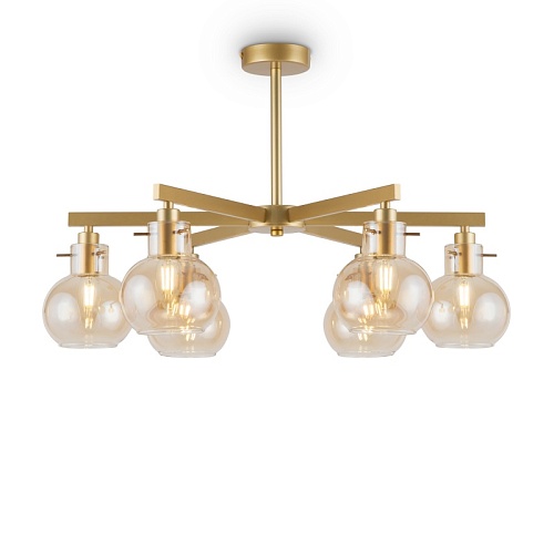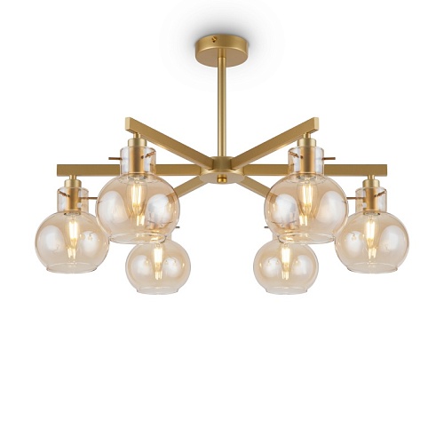 Металлическая арматура в золотом цвете. Стеклянные плафоны трендовой обтекаемой формы. Оттенок плафонов – шампань. Геометричный дизайн. Источник света – лампа с цоколем E14.