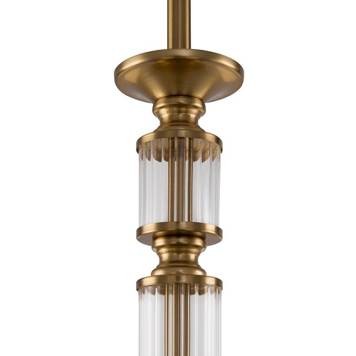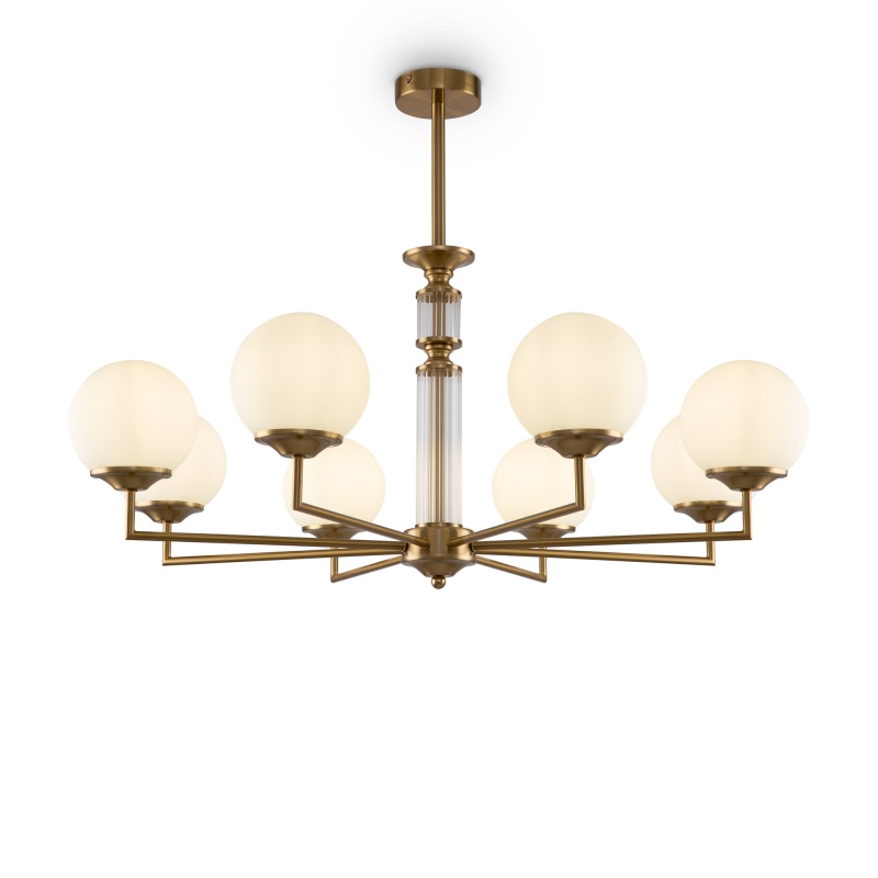Металлическая арматура окрашена в цвет латуни. Плафоны-сферы из матового белого стекла. Декор – прозрачное рельефное стекло. Источник света – лампа с цоколем Е27.