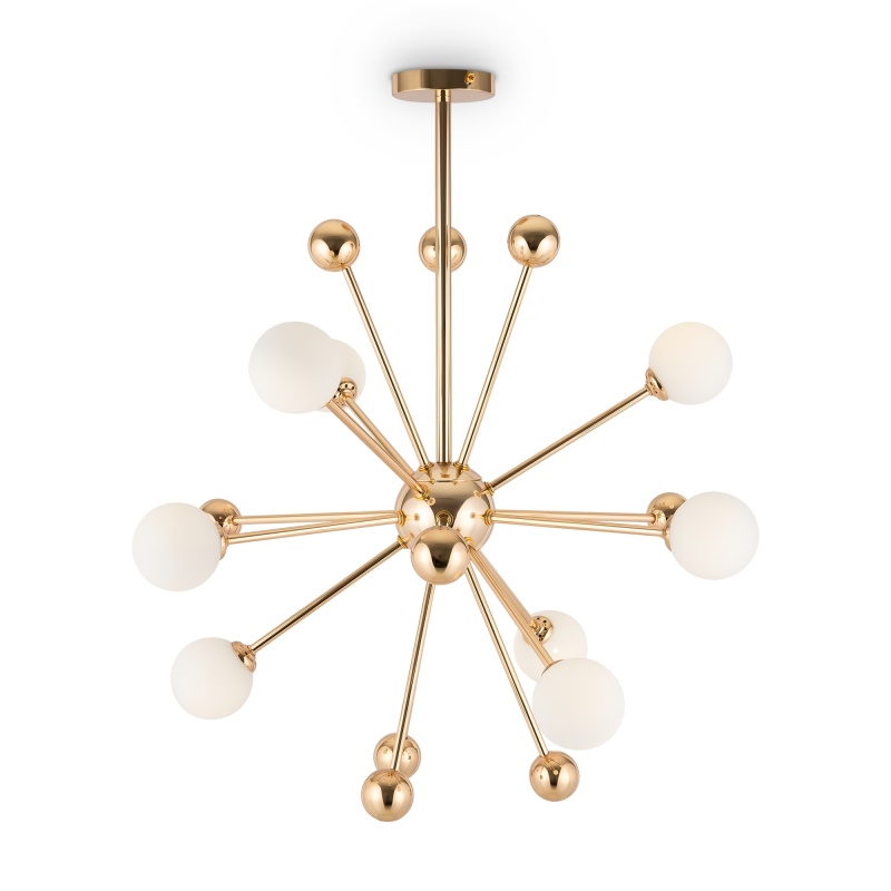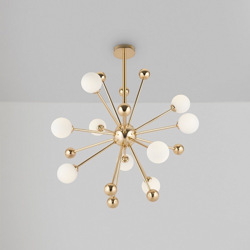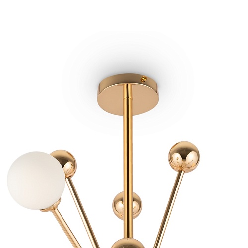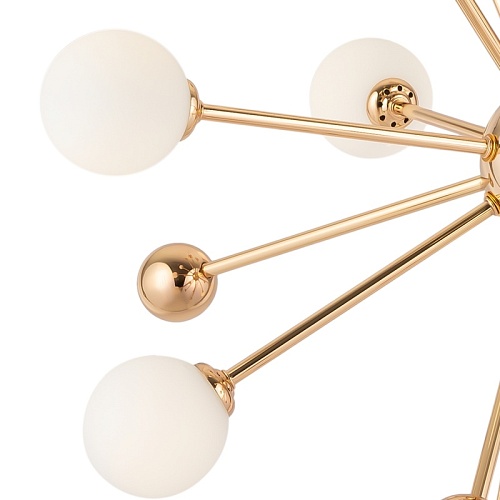 Арматура из металла оттенка французского золота. Плафоны-сферы – матовое белое стекло. Металлический декор окрашен в тон арматуре. Трендовый дизайн в стиле ретрофутуризма. Источник света – лампа G9.