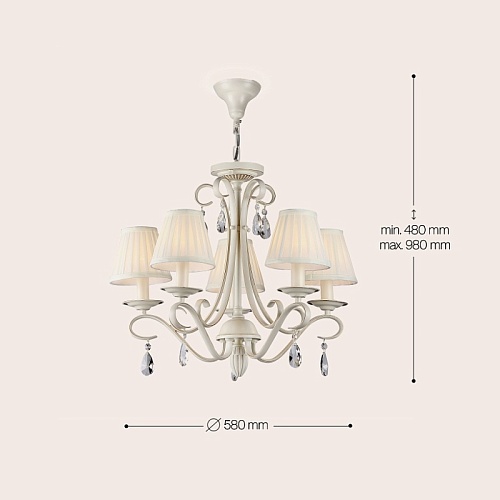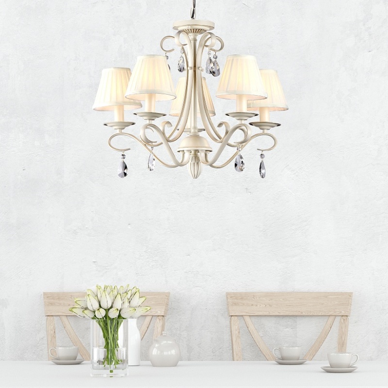 Материал арматуры — металл, цвет — бежевый. Белые абажуры из органзы изготовлены по технологии намотки. Декоративные подвески из прозрачных кристаллов. Регулируемая высота подвесных светильников. Источник света - лампа с цоколем Е14.