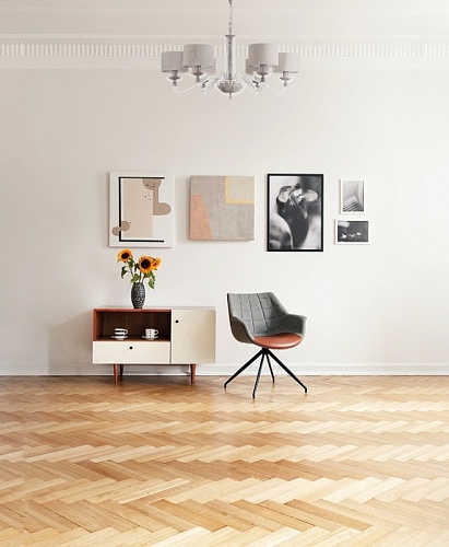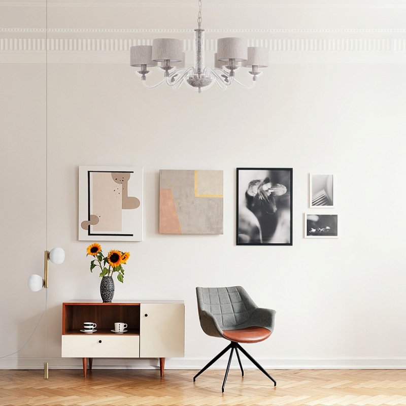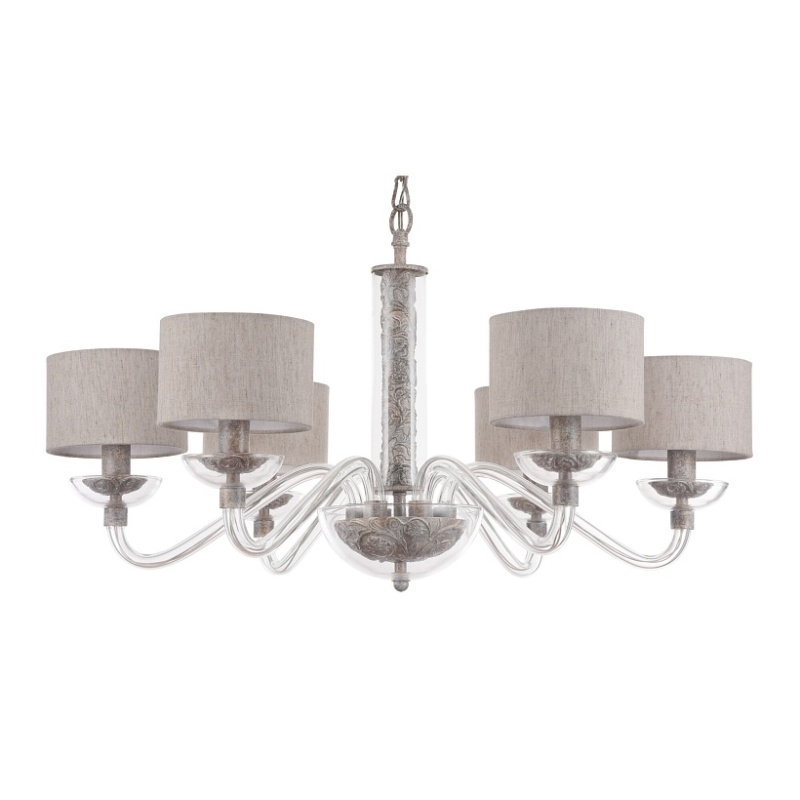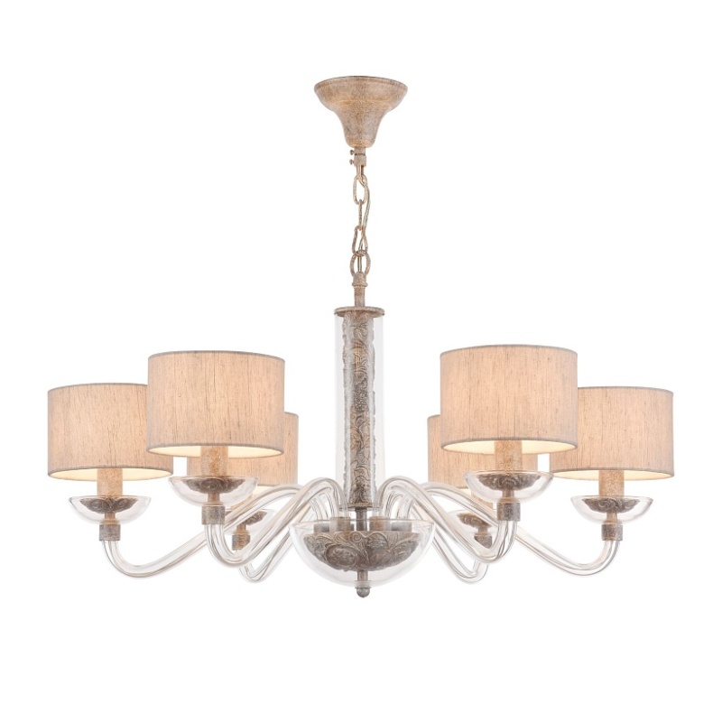 Металлическая арматура в бронзовом цвете с эффектом искусственного старе ния. Текстильные абажуры изготовлены по технике намотки, оттенок – натураль ный лен. Декор – полирезин с флористическим узором, заключенный в прозрач--- ное стекло. Крепление 2 в 1 – монтаж с цепью и без нее.