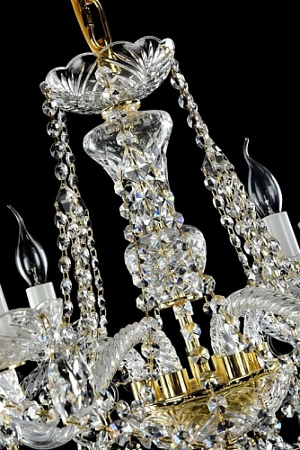 Металлическая арматура золотого цвета. Рожки – витое прозрачное стекло. Рельефный стеклянный декор обрамляет контуры светильника. Подвески из крис таллов различных форм и огранки.