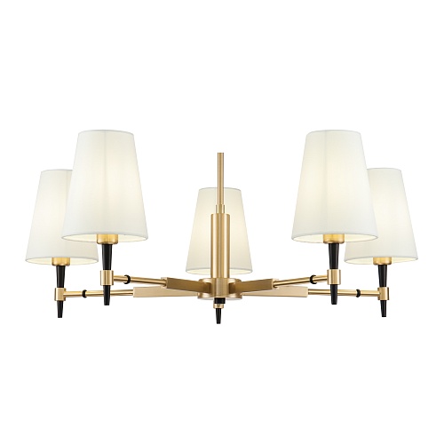 Металлическая арматура, гальванизация в цвет латуни. Часть элементов окрашена в черный цвет. Абажуры из белого текстиля, нанесенного на ПВХ. Источник света - лампа с цоколем Е14.