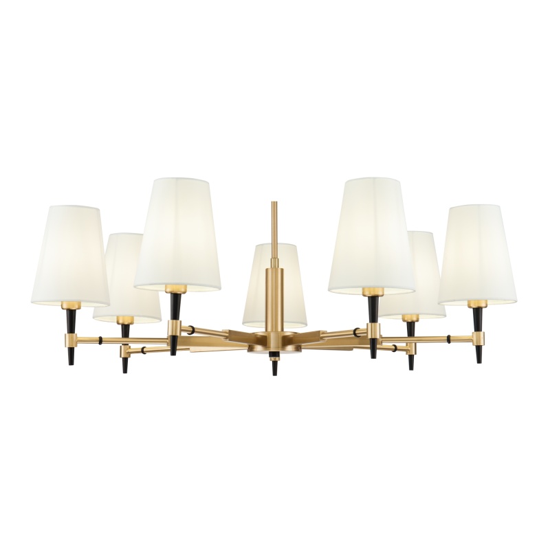 Металлическая арматура, гальванизация в цвет латуни. Часть элементов окрашена в черный цвет. Абажуры из белого текстиля, нанесенного на ПВХ. Источник света - лампа с цоколем Е14.