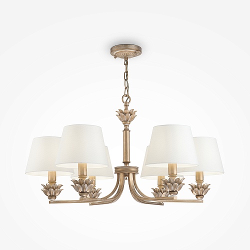 Материал арматуры – металл, цвет – античное золото. Материал абажуров – тек- стиль, нанесенный на ПВХ, оттенок – белый. Флористический декор – штампованный металл. Регулируемая высота подвесного светильника.