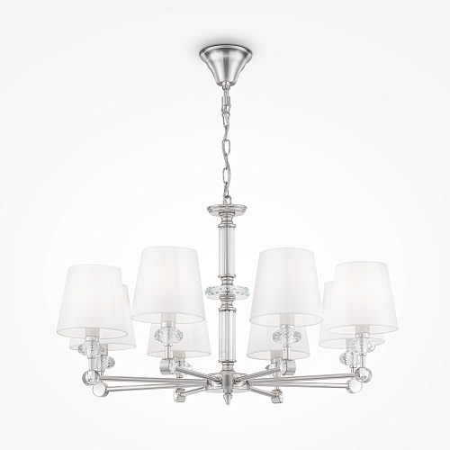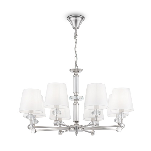 Материал арматуры – нержавеющая сталь, цвет – хром. Материал абажуров – текстиль на ПВХ, цвет – белый. Декор – прозрачное стекло. Акцентные стеклянные кристаллы на рожках со сложной огранкой.