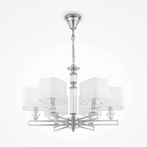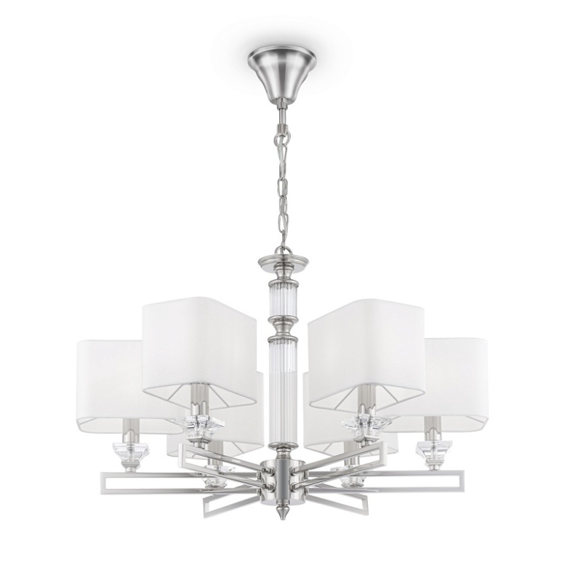 Хромированная металлическая арматура. Абажуры из белого текстиля, нанесенного на ПВХ. Стеклянный декор центральной части и розеток. Геометрические рожки.