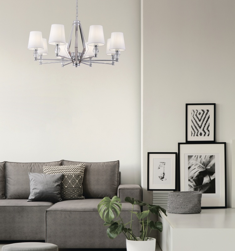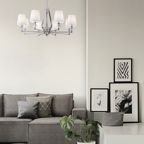 Хромированная арматура подвесных светильников Stein напоминает конструкцию зонта. "Спицы" оформлены кристаллами. Абажуры белого цвета мягко рассеивают свет. Люстры на 8 и 6 рожков и бра в стиле модерн. Высота подвесных светильников регулируется длиной цепи. Подойдут для освещения и декорирования гостиниц, кафе, спален или гостиных.