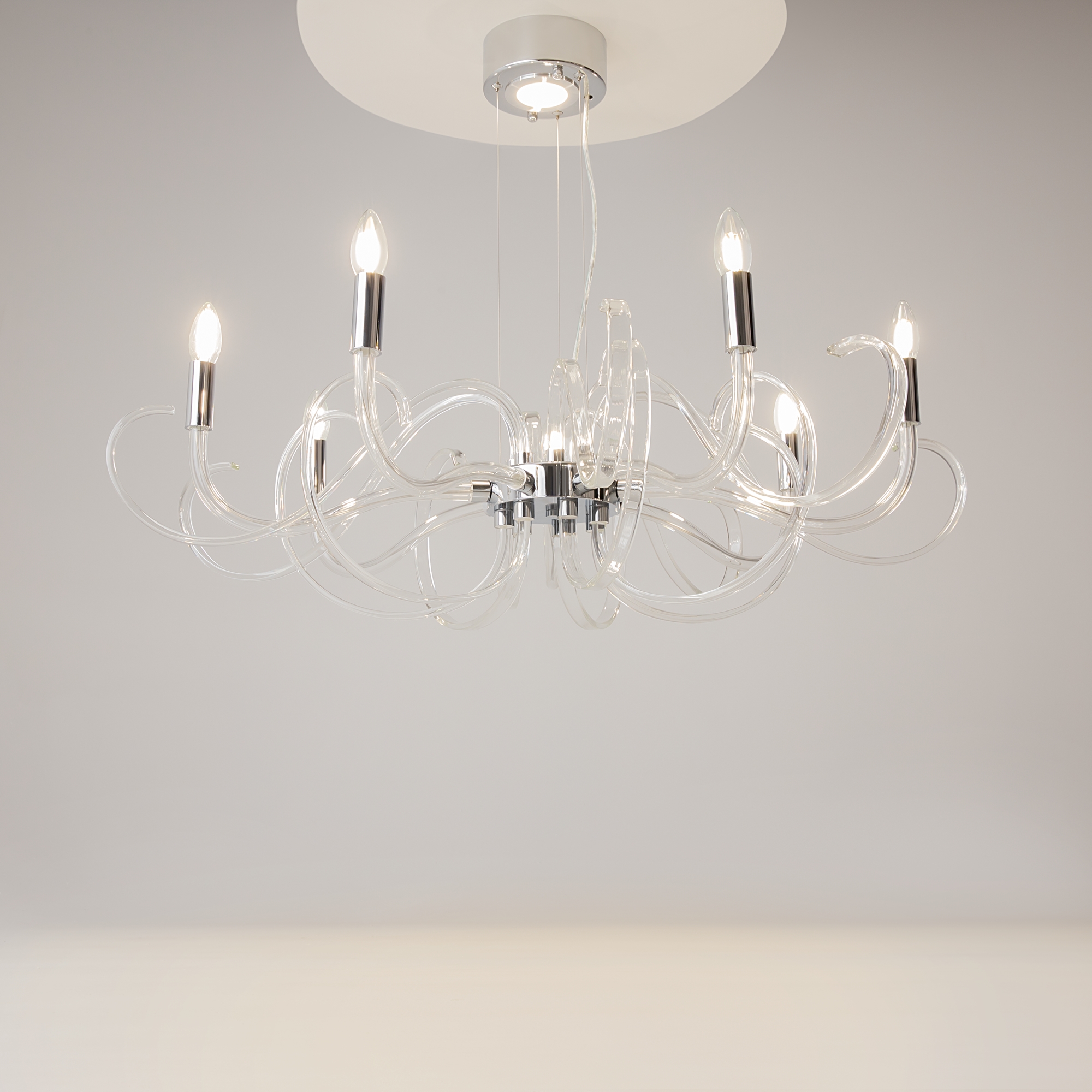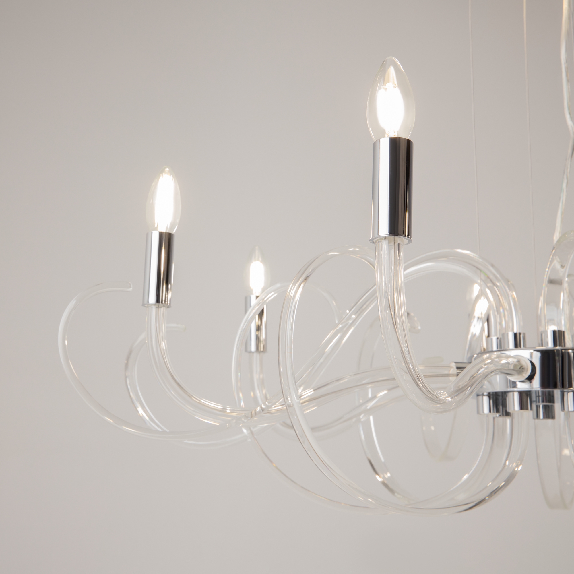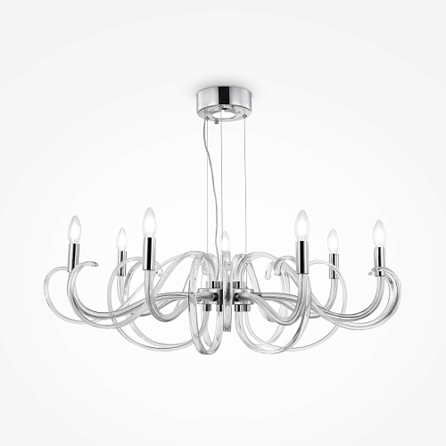 Материал арматуры – металл, цвет – хром. Декоративные рожки из прозрачного стекла. Трендовые обтекаемые формы в дизайне. Высота подвесных люстр регулируется тросом. Источник света - лампа с цоколем Е14.
