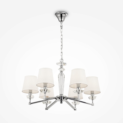 Металлическая арматура с гальваническим покрытием цвета никель. Абажуры из льна, нанесенного на ПВХ. Цвет абажуров – белый. Декор центральной части и рожков – прозрачное стекло. Высота люстр регулируется.
