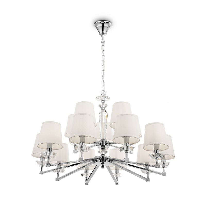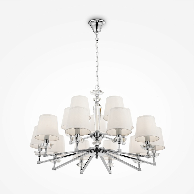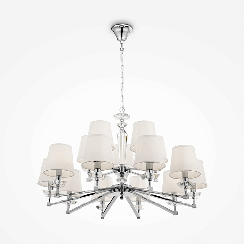 Металлическая арматура с гальваническим покрытием цвета никель. Абажуры из льна, нанесенного на ПВХ. Цвет абажуров – белый. Декор центральной части и рожков – прозрачное стекло. Высота люстр регулируется.