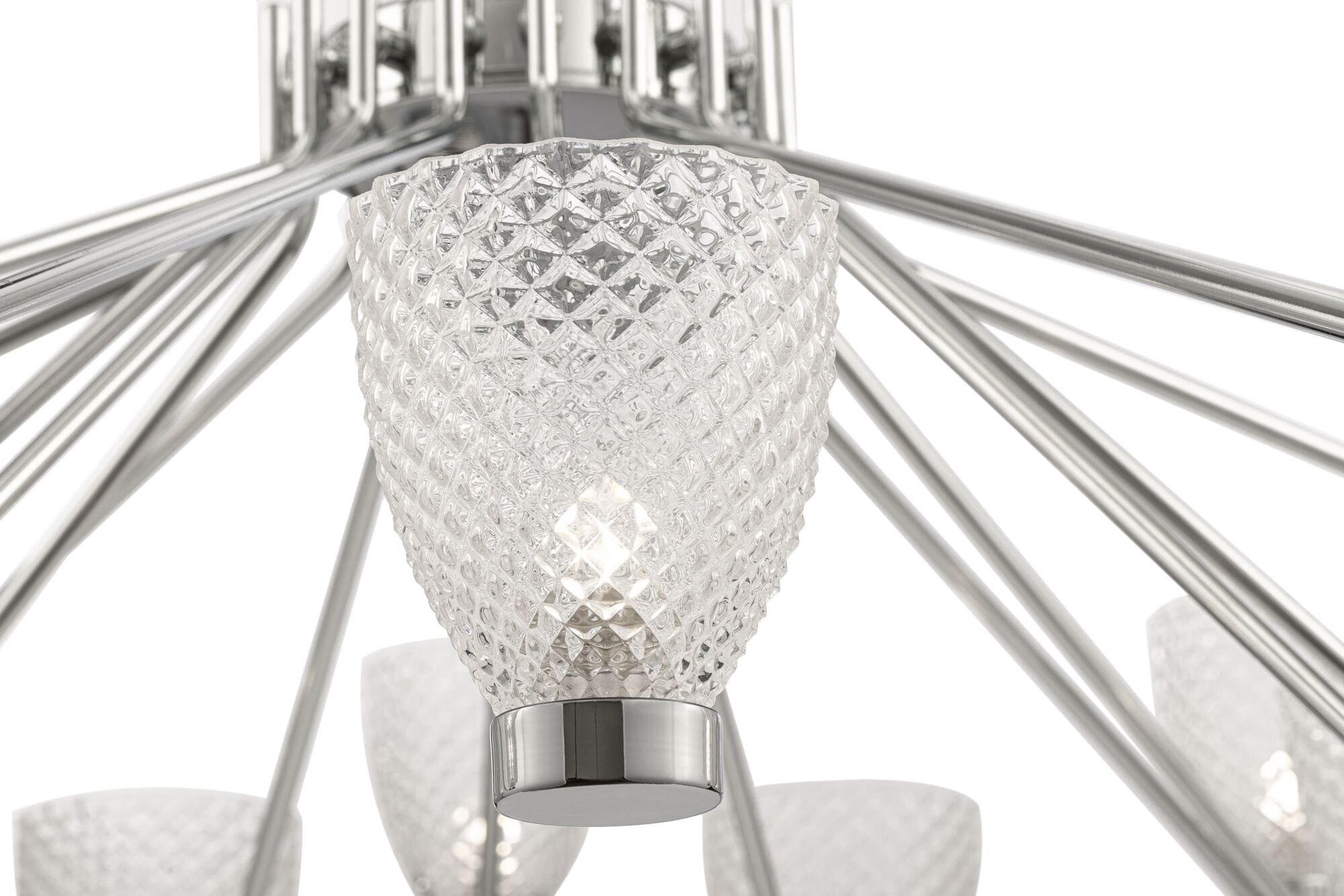 Серия современных светильников. Плафоны сделаны из прозрачного стекла со "стеганным" эффектом. Металлические детали выполнены в цвете хром. Благодаря чему модели выглядят легко и сдержанно. Они станут украшением в любом интерьере, дополнив его своей оригинальностью. Высоту подвесных светильников можно отрегулировать длиной цепи.