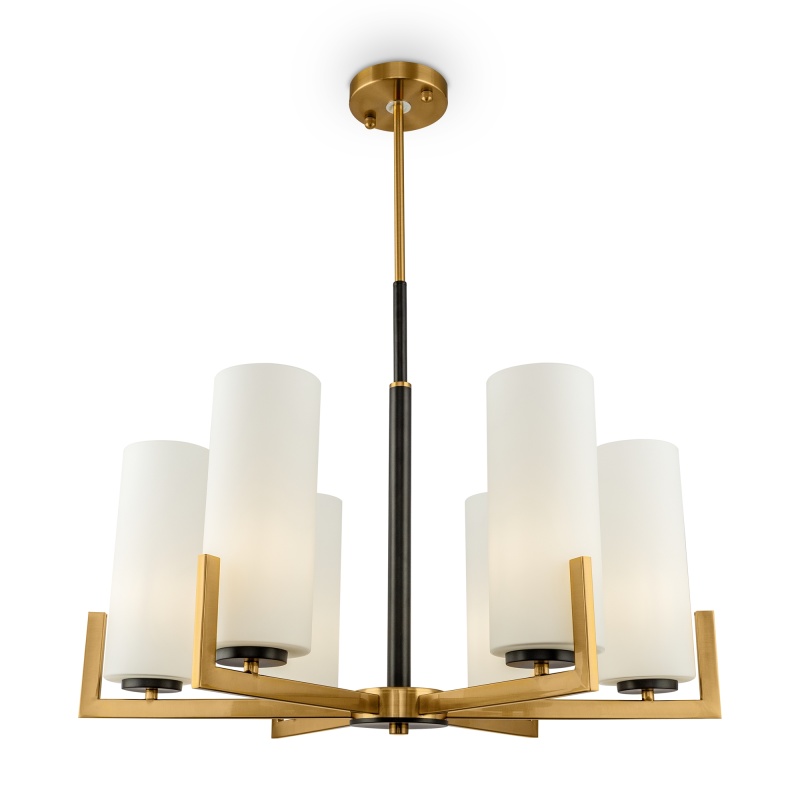 Арматура из металла, оттенок — латунь. Стеклянные плафоны в белом цвете. Часть элементов окрашена в контрастный черный оттенок. Геометрия в дизайне: цилиндрические плафоны, прямоугольные рожки.