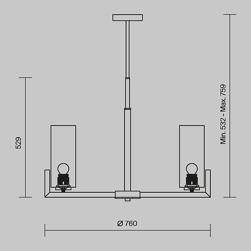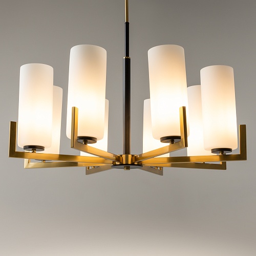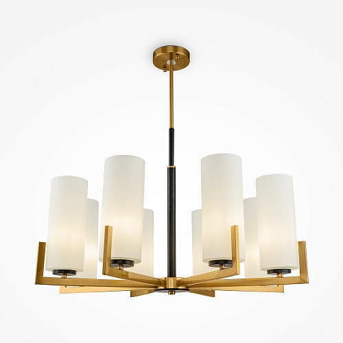 Арматура из металла, оттенок — латунь. Стеклянные плафоны в белом цвете. Часть элементов окрашена в контрастный черный оттенок. Геометрия в дизайне: цилиндрические плафоны, прямоугольные рожки.