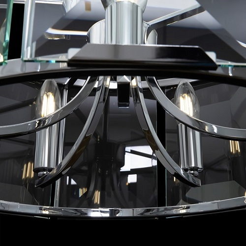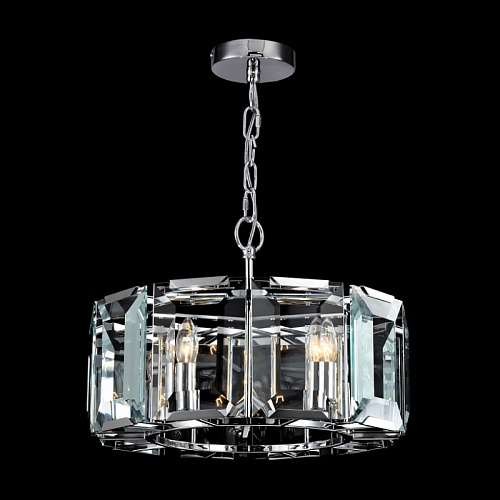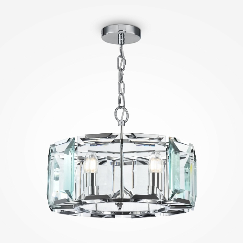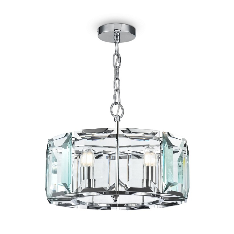 Арматура из металла, цвет – хром. Плафон составляют пластины из прозрачного оптического стекла. Металлический каркас плафона окрашен в тон арматуре. Высота подвесных моделелей регулируется.