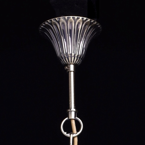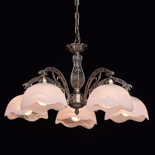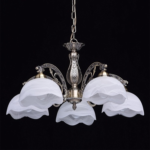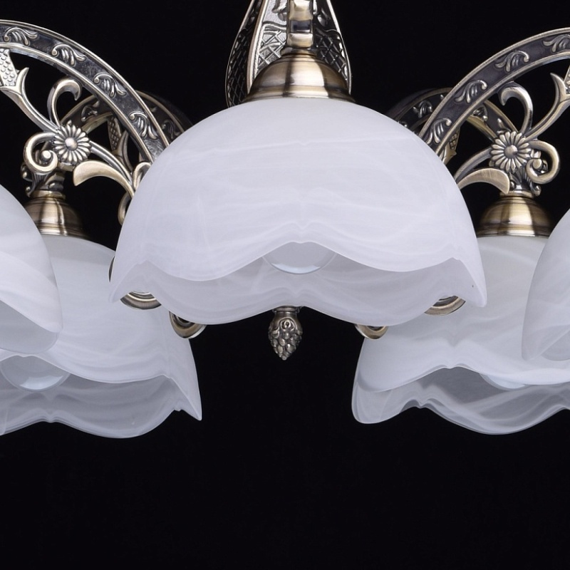 Основание: комбинация сплавов металлов, гальванизирована в цвет античной бронзы с патинированием и лакированием. Центральный стержень, рожки, декоративные элементы: сплав алюминия, художественное литье.Потолочная чаша, корпус, декоративные розетки: металл, прессование.Плафон: отлит в сложную форму, матирование в белый цвет, алебастровое стекло.