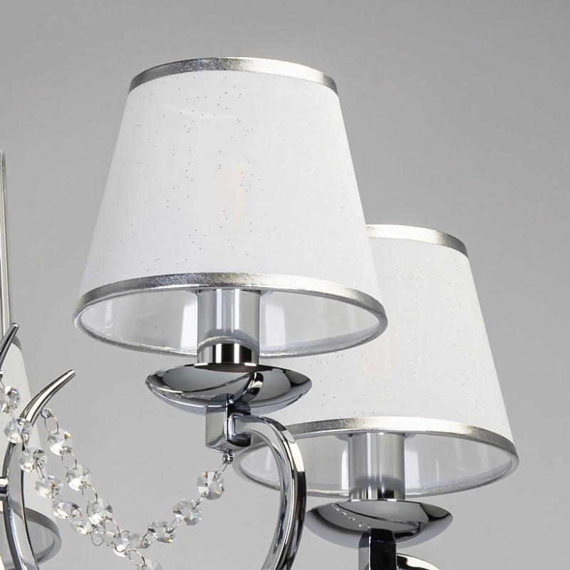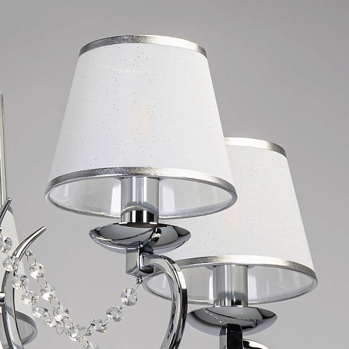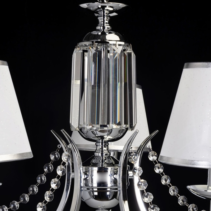 Металлическое основание подвесной люстры гальванизировано в цвет хрома. Двухслойные текстильные абажуры белого цвета отделаны кантом серебряного цвета. Люстра декорирована прозрачным хрусталем прямоугольной формы и формы октагон.