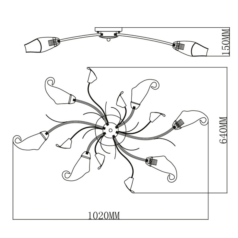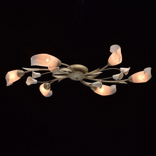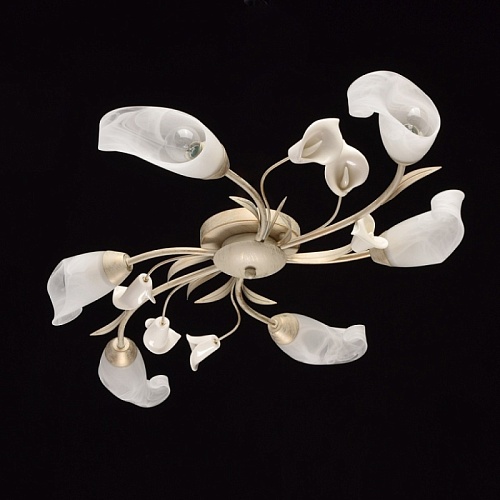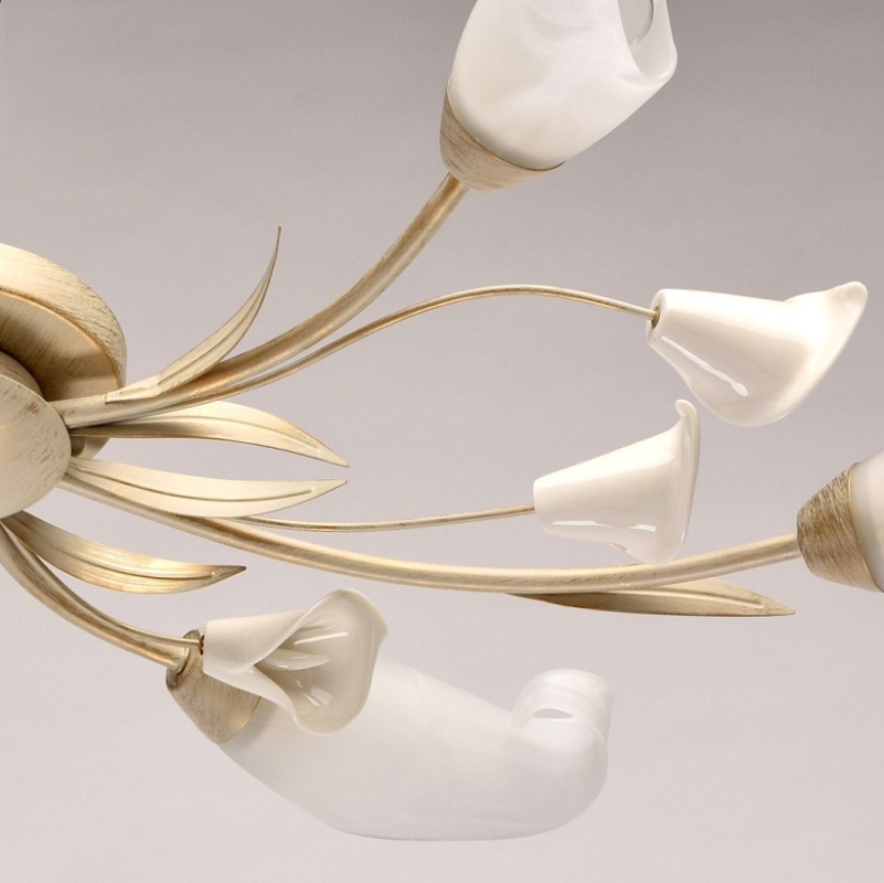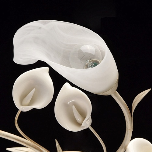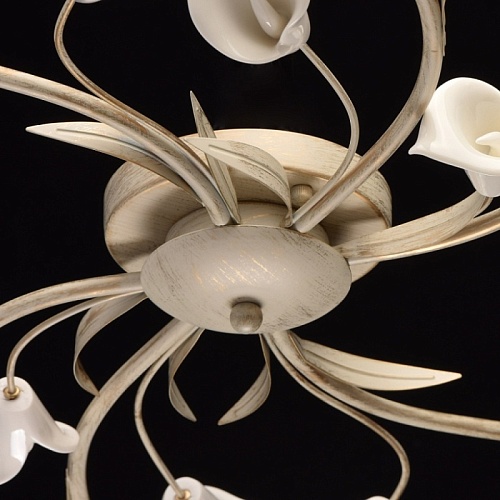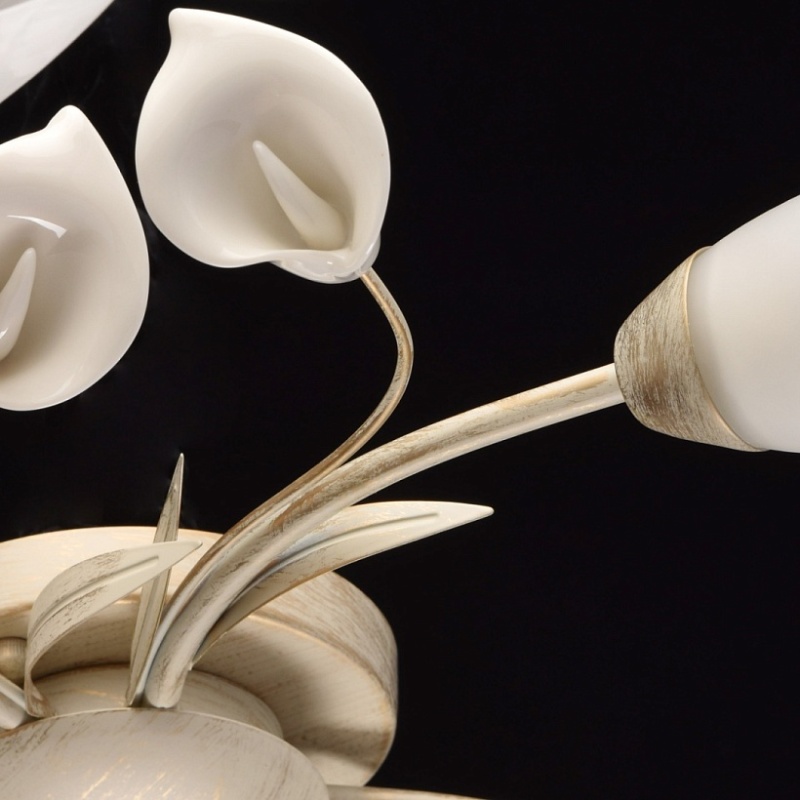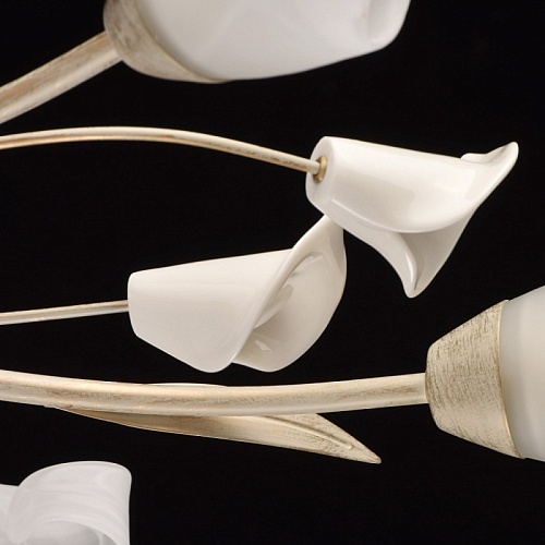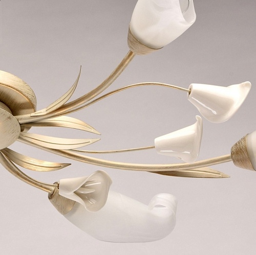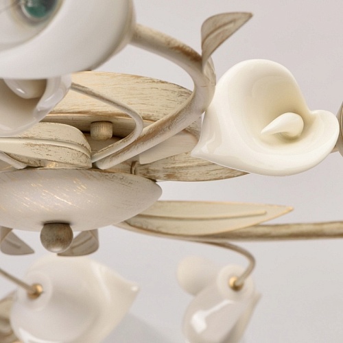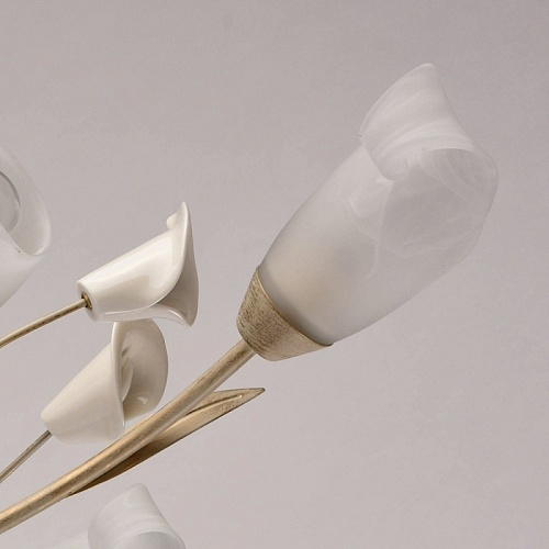Основание: сплав металла, обработано по технологии двойного окрашивания, основной слой золотого цвета, декоративный слой - цвета слоновой кости. Корпус, декоративные розетки: обработка на токарном станке.Рожки, декоративные элементы: прокат на роликовом станке.Плафоны: гутное алебастровое стекло.Декор: глазурированный фарфор.
