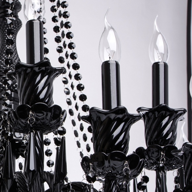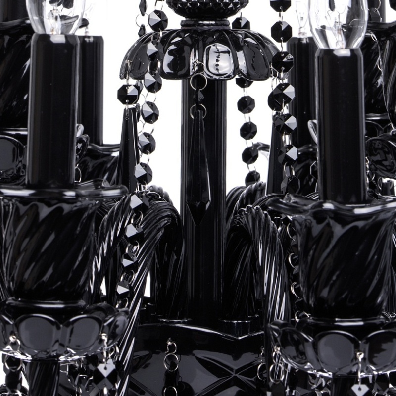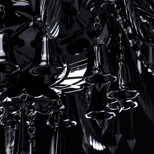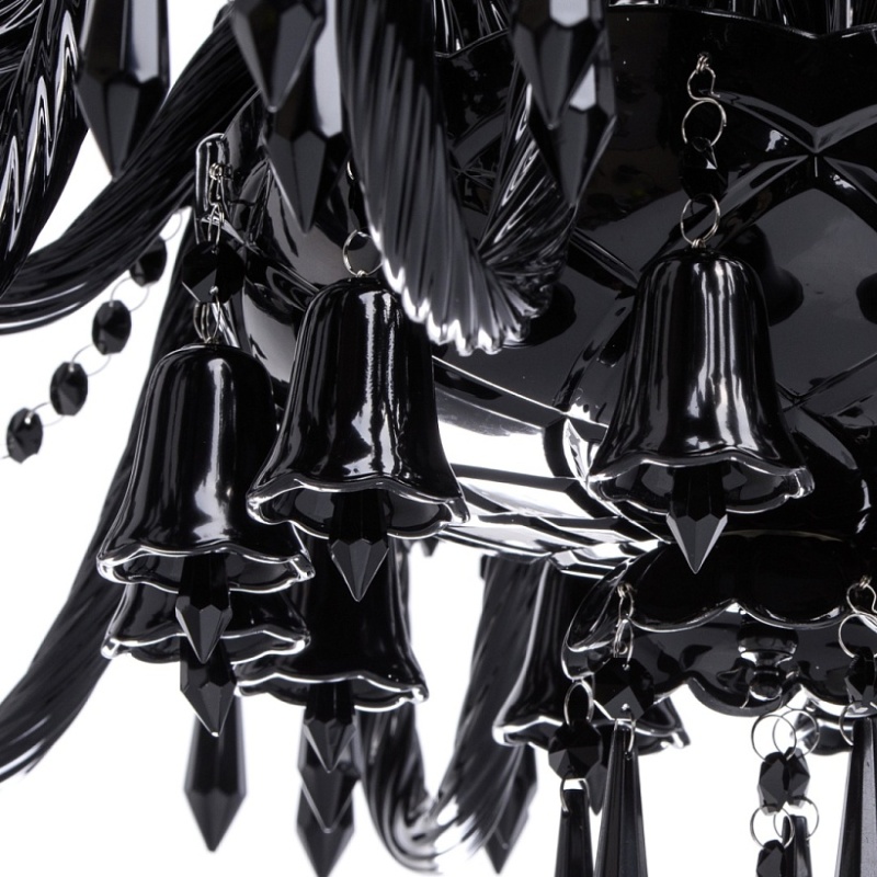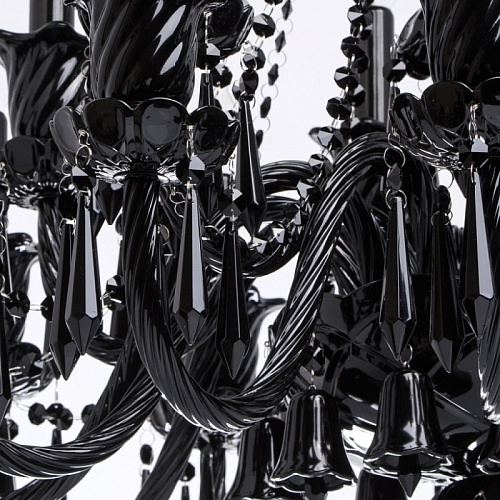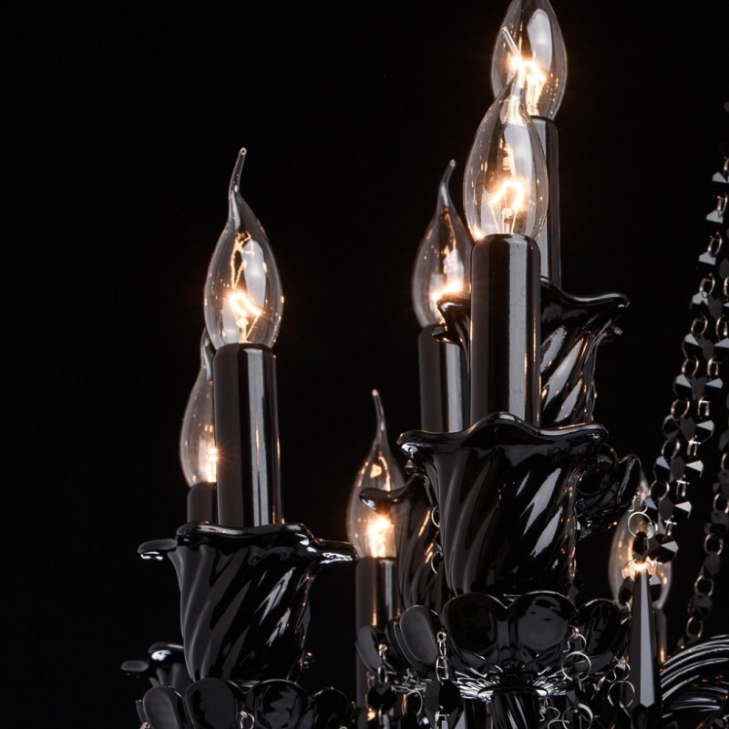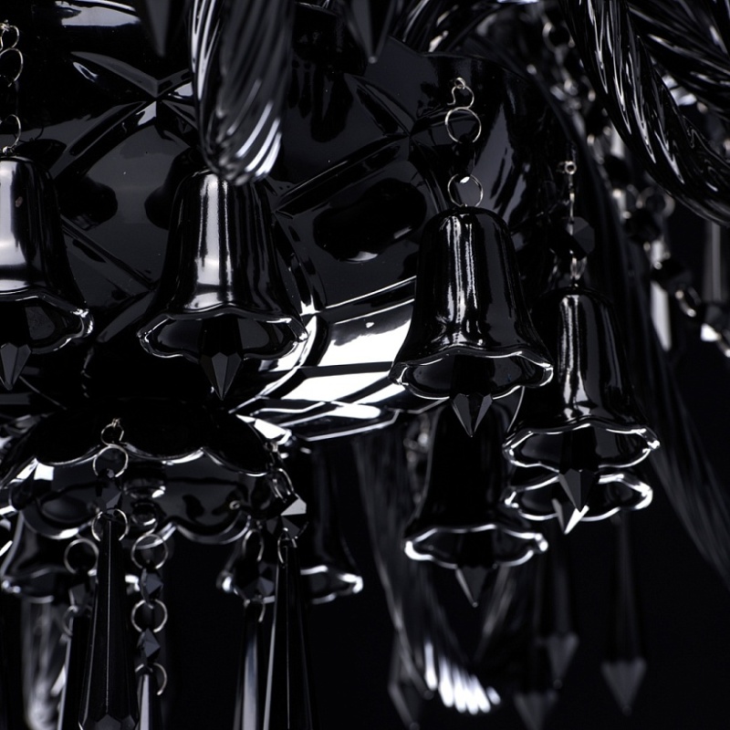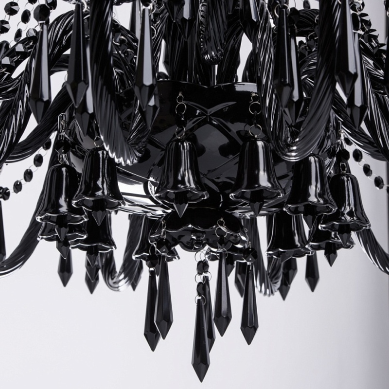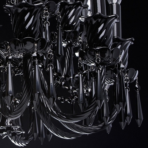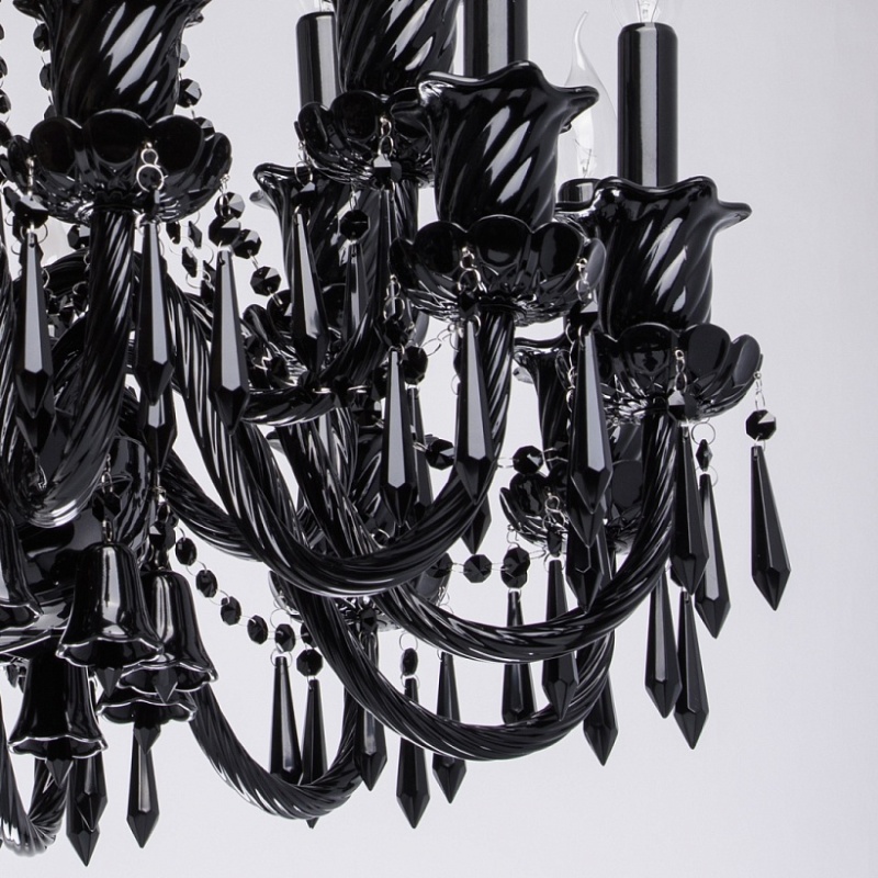 Корпус светильника выполнен из металла и декорирован стеклом, окрашенным в массе в глянцевый черный цвет. Рожки выполнены из витого стекла гутным способом. Светильник декорирован подвесками из хрусталя сложной огранки.