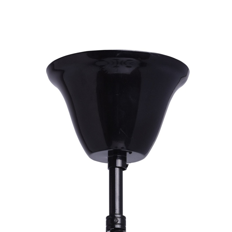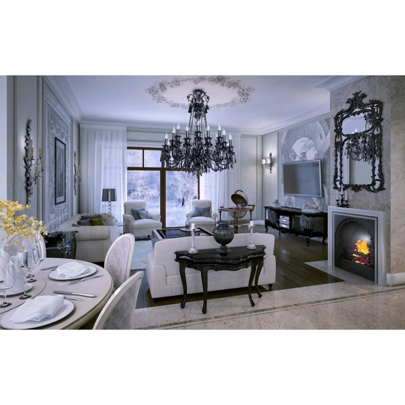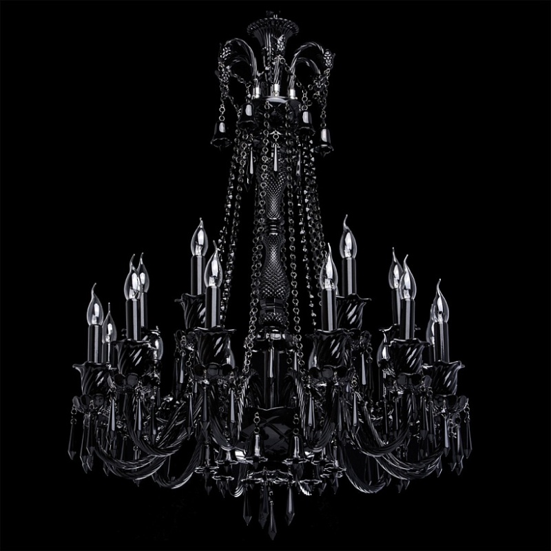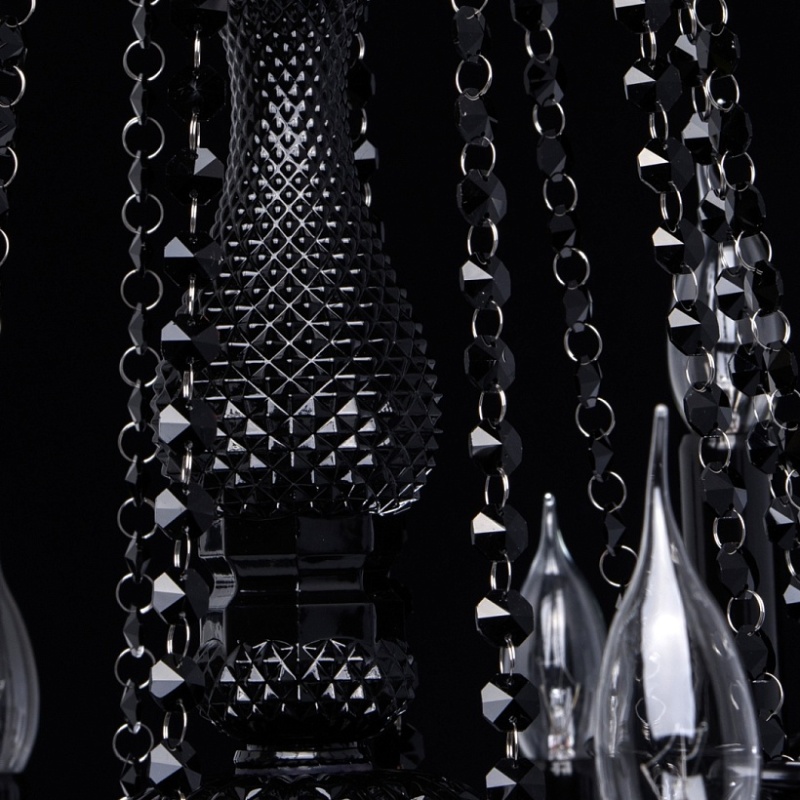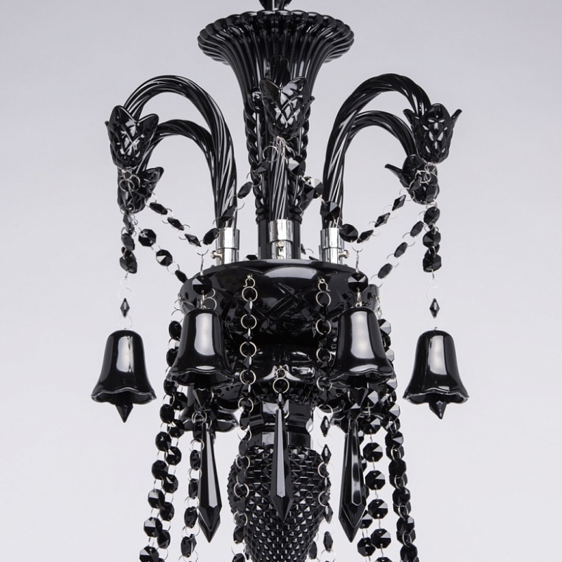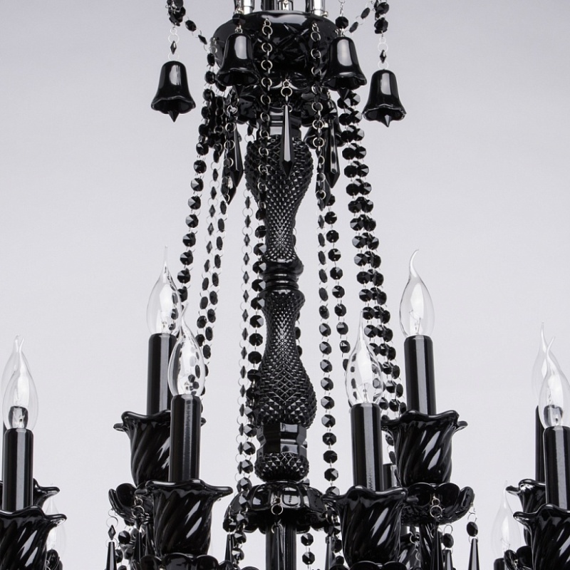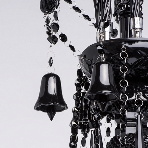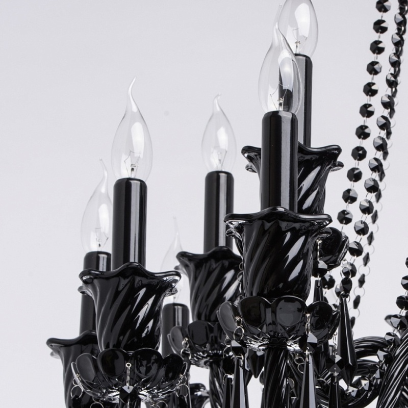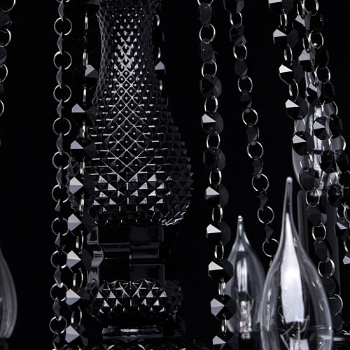 Корпус светильника выполнен из металла и декорирован стеклом, окрашенным в массе в глянцевый черный цвет. Рожки выполнены из витого стекла гутным способом. Светильник декорирован подвесками из хрусталя сложной огранки.