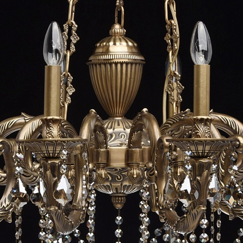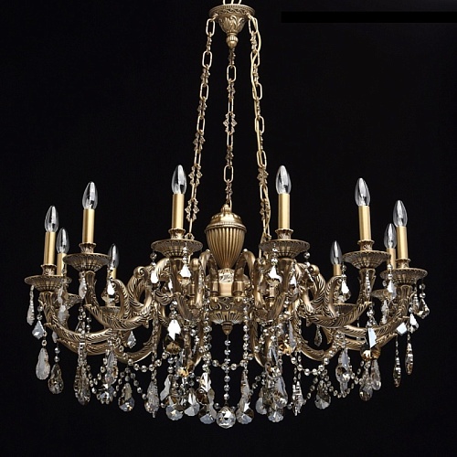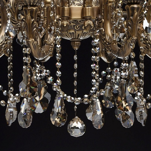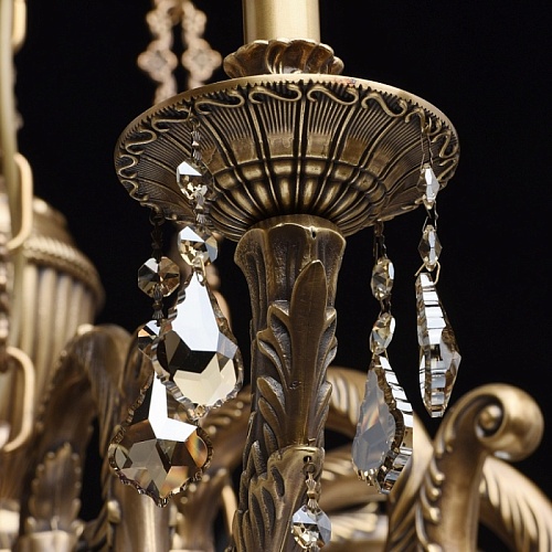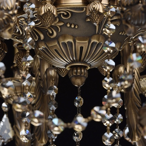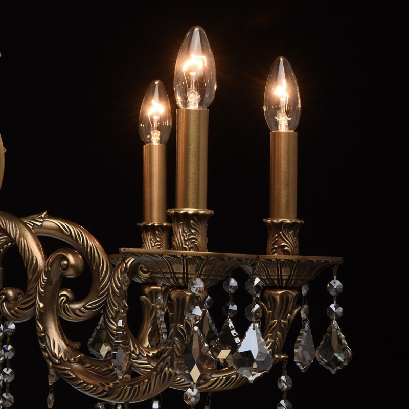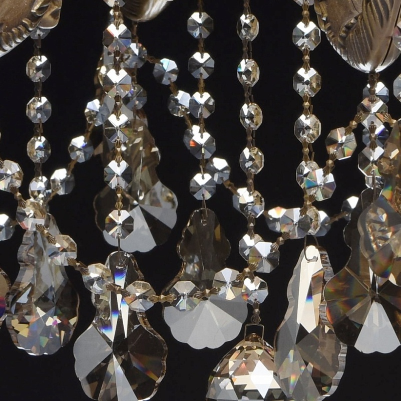 Основание светильника выполнено из бронзы по исторической технологии художественного литья в одноразовые песчано-глинистые формы. Светильник декорирован хрусталем высокого качества формы дубовый лист, гальванизированным в цвет шампань