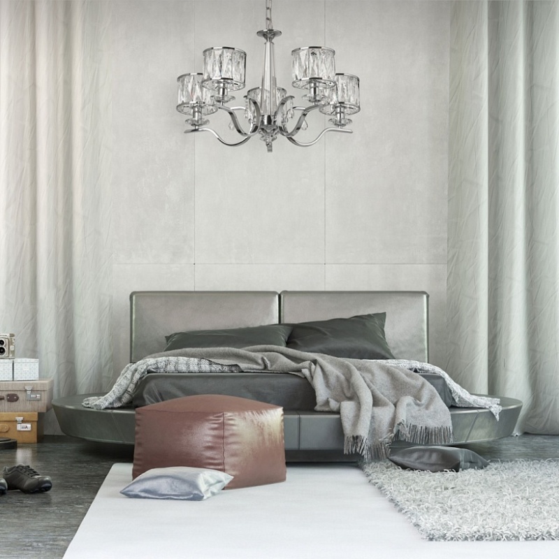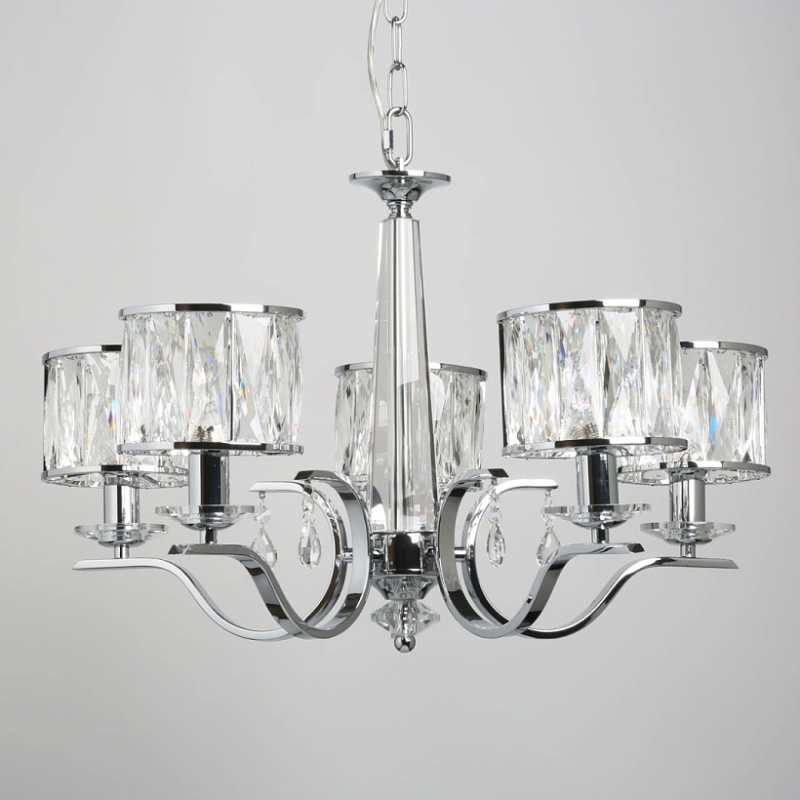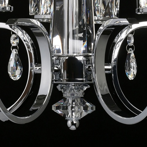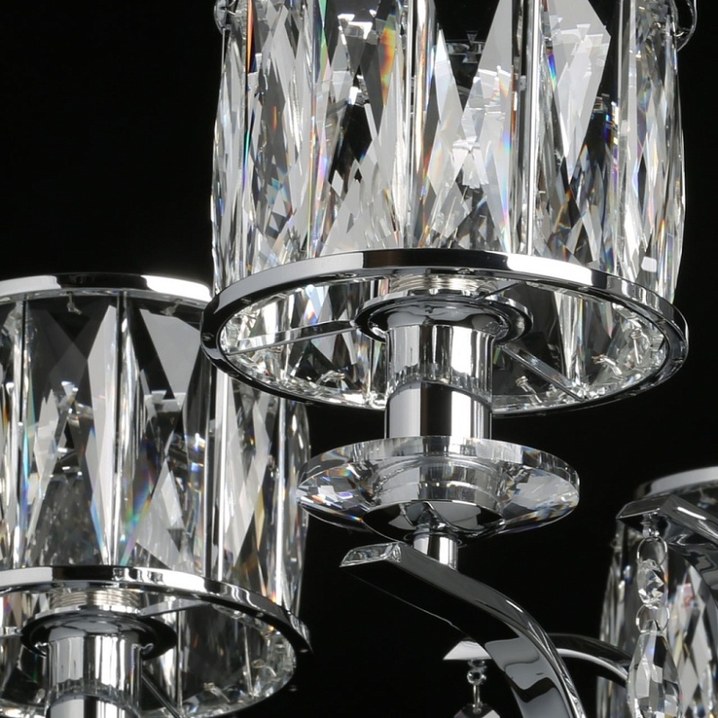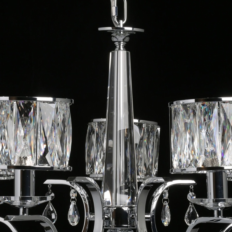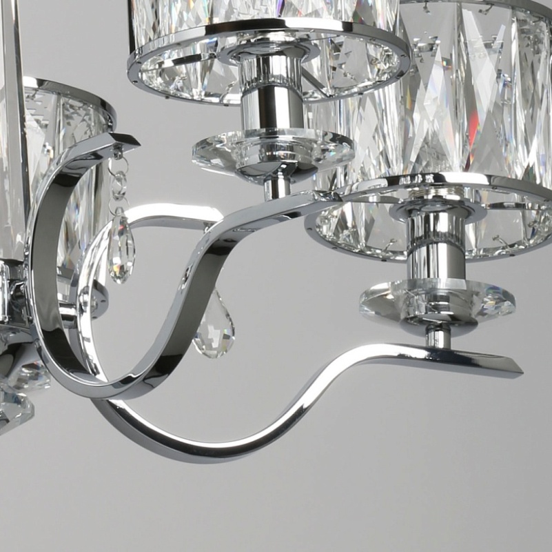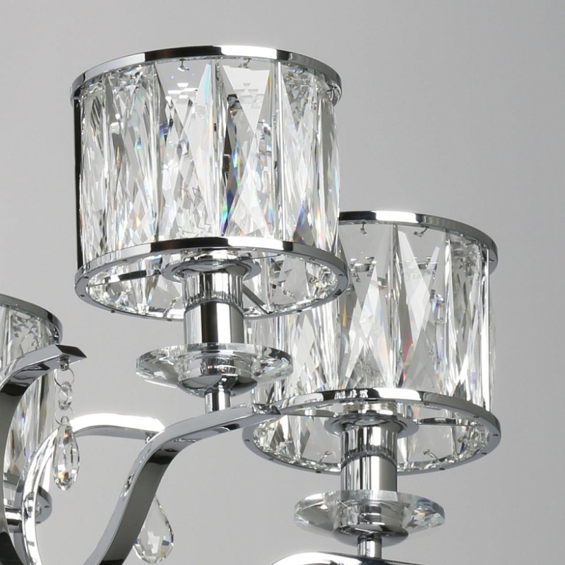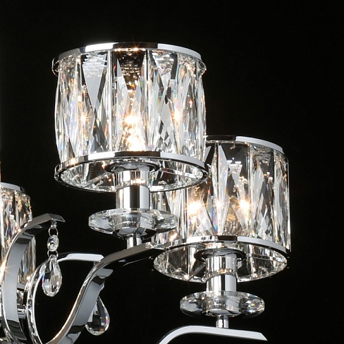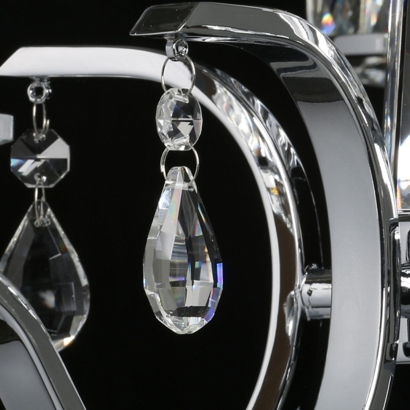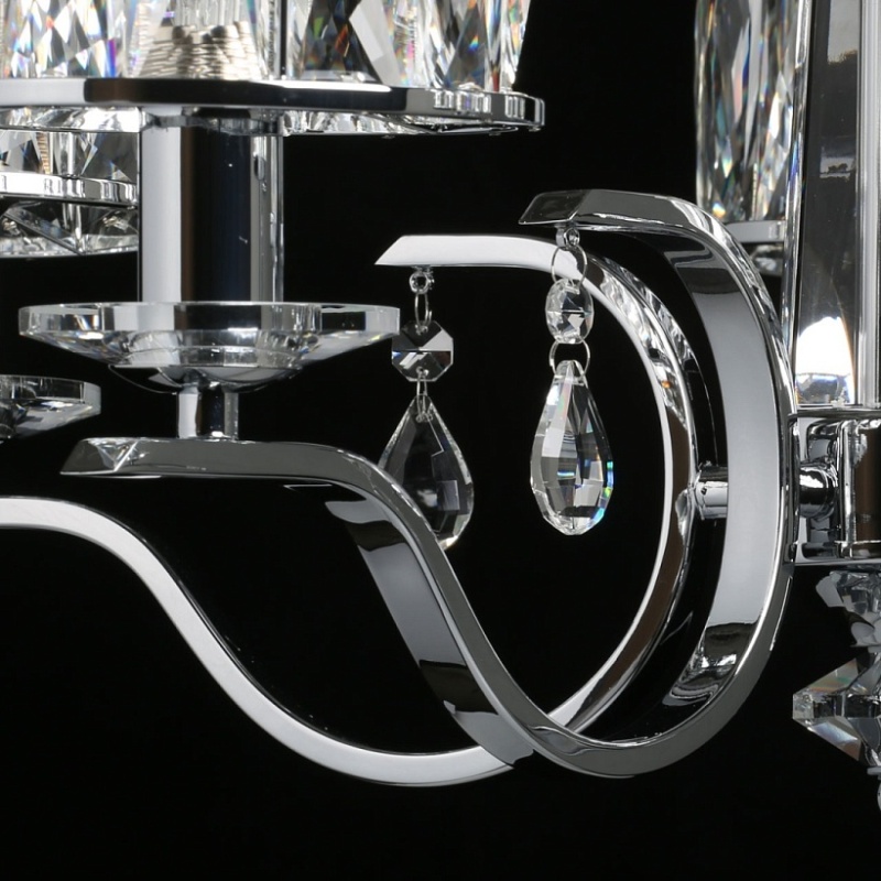 Металлическое основание светильника гальванизировано в цвет хрома. Светильник декорирован хрусталем прямоугольной формы. Декоративные розетки выполнены из массива хрусталя. Центральная ось декорирована массивом хрусталя.