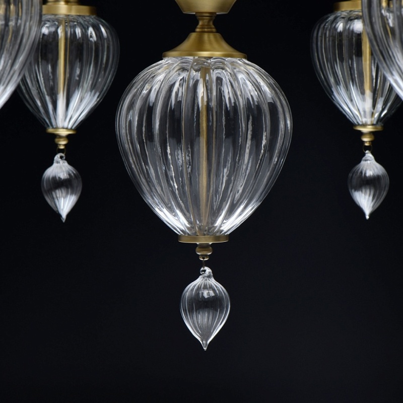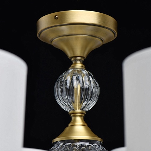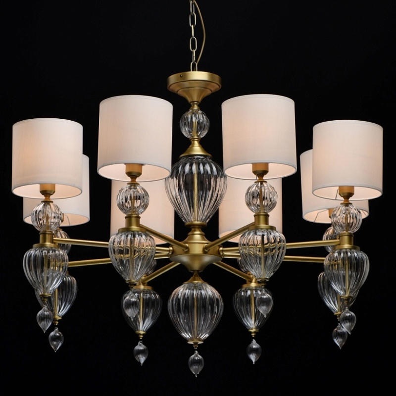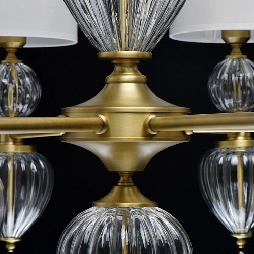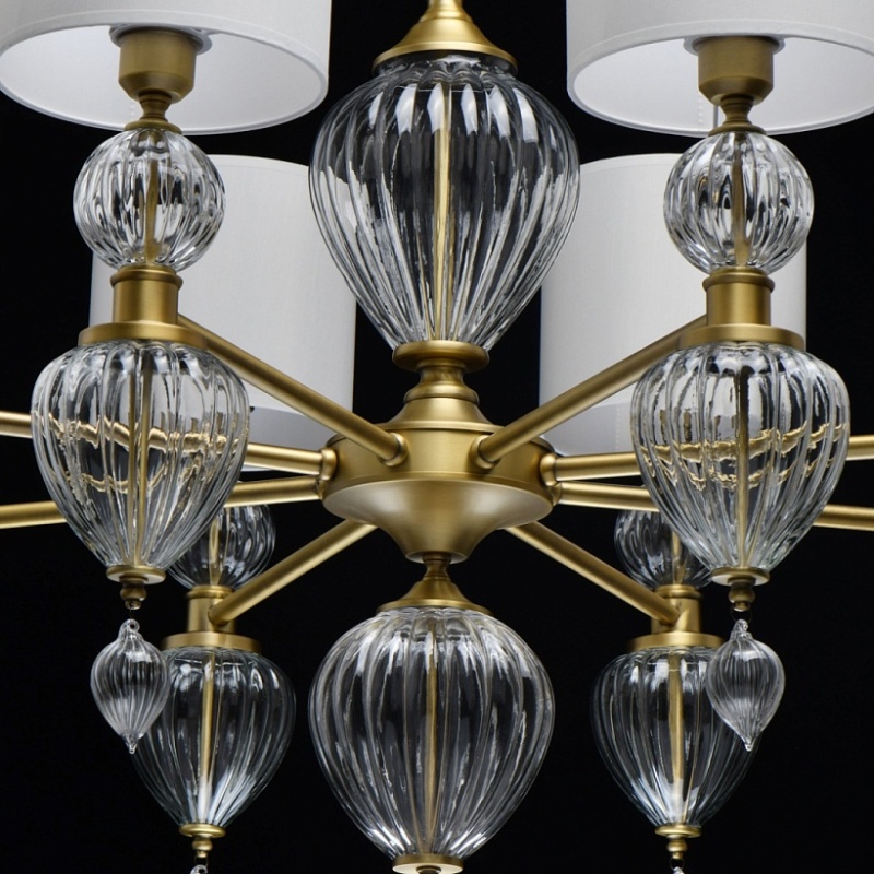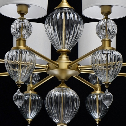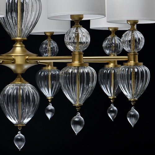 Основание светильника выполнено из металла и гальванизировано в цвет латуни. Светильник декорирован выдувным стеклом ручной работы. Текстильные абажуры белого цвета с термостойким акрилом внутри, отделаны кантом и прошиты.