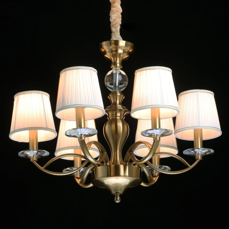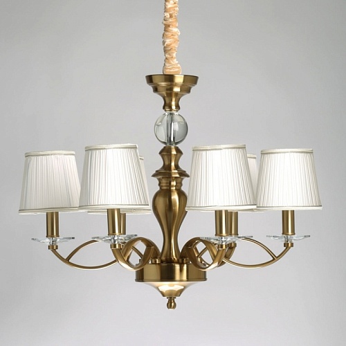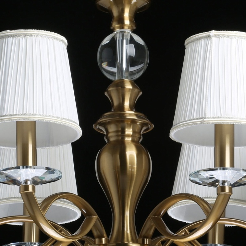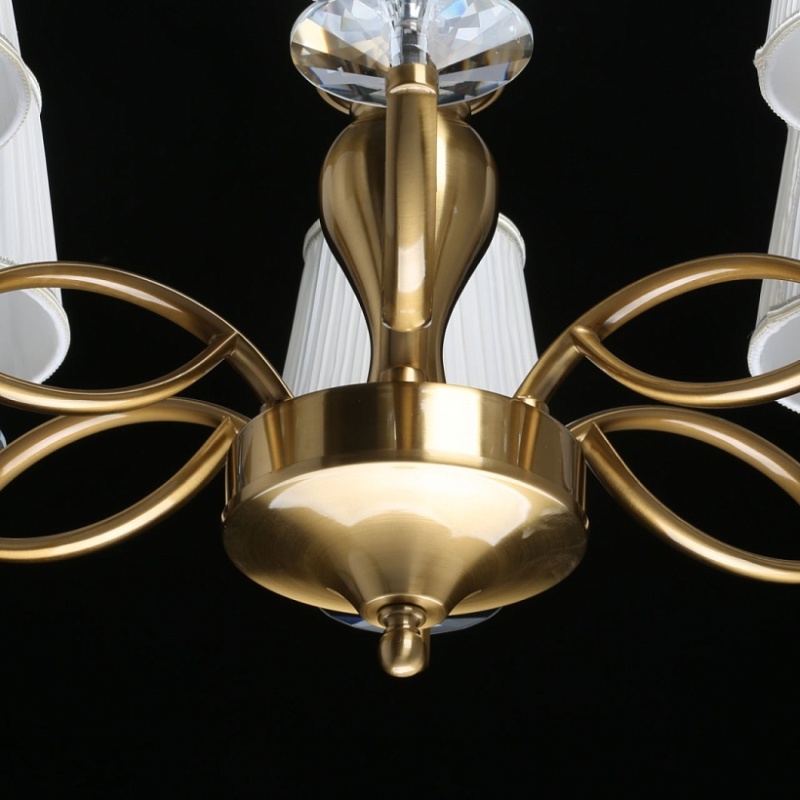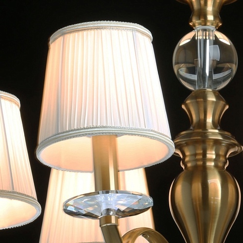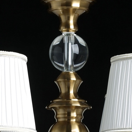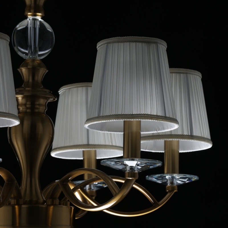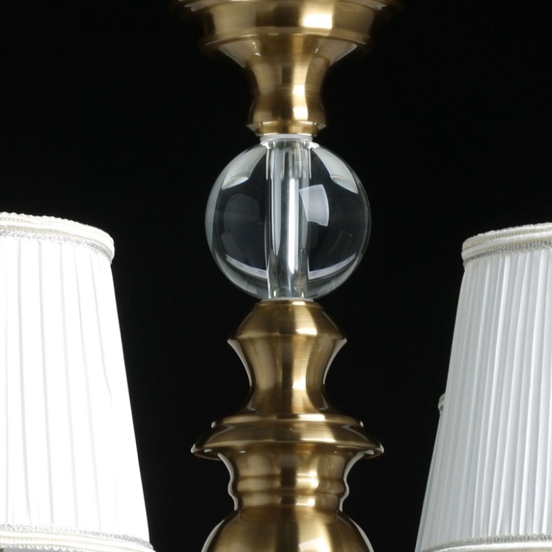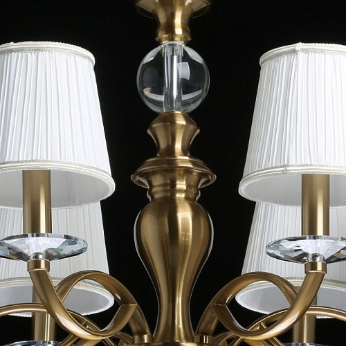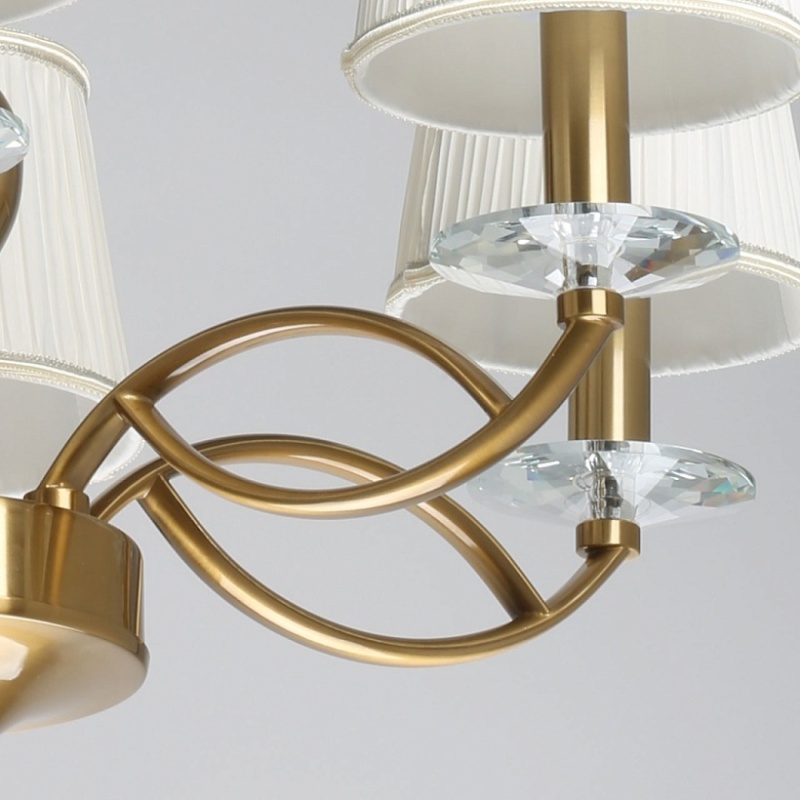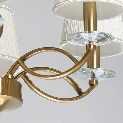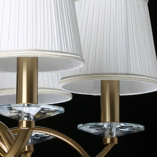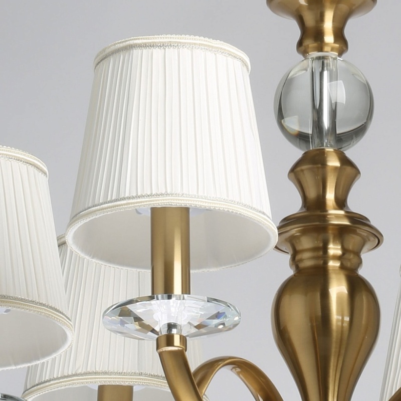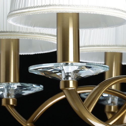 Металлическое основание потолочной люстры гальванизировано в цвет медовая бронза. Источники света закрыты белыми текстильными абажурами. Люстра декорирована массивами хрусталя.