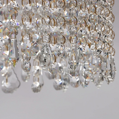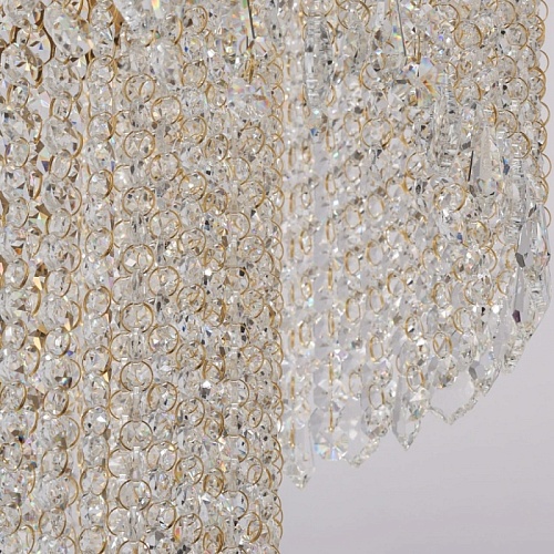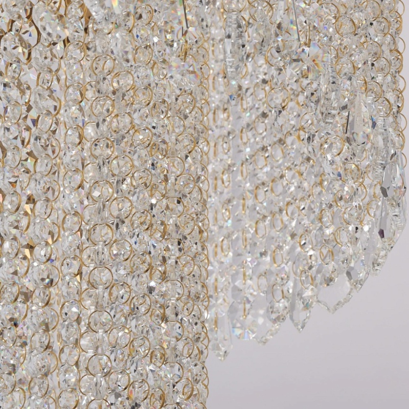 Основание люстры из нержавеющей стали гальванизировано в цвет золота. Люстра декорирована каскадом подвесок из прозрачного хрусталя.