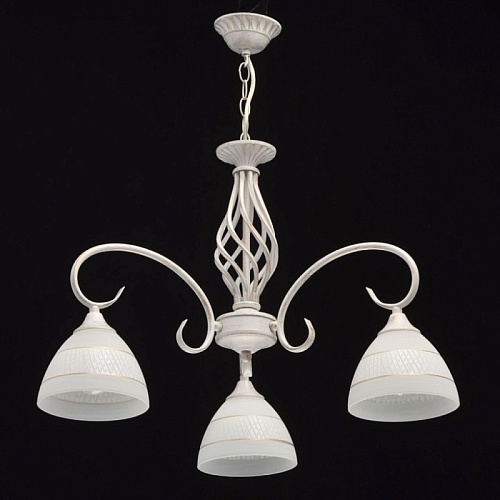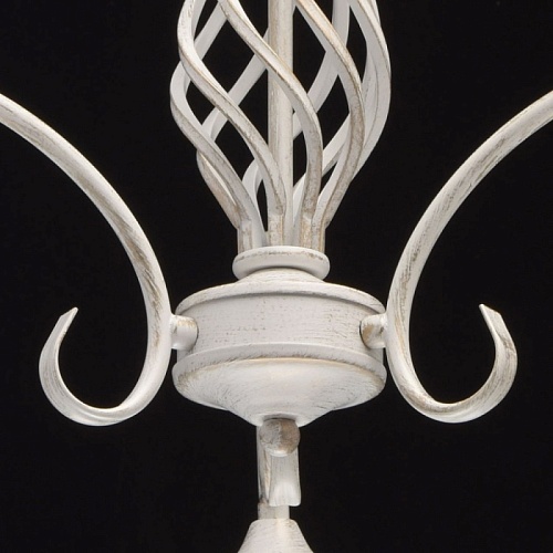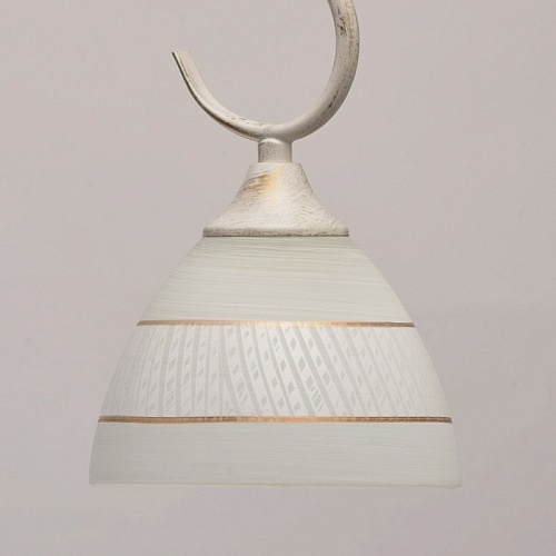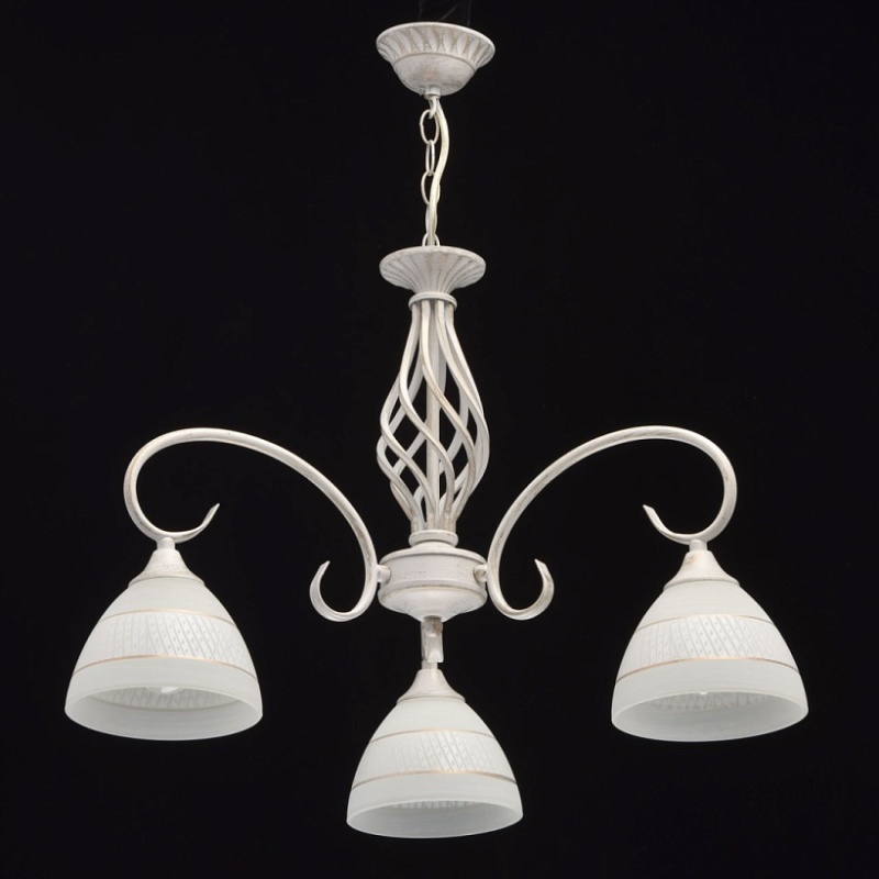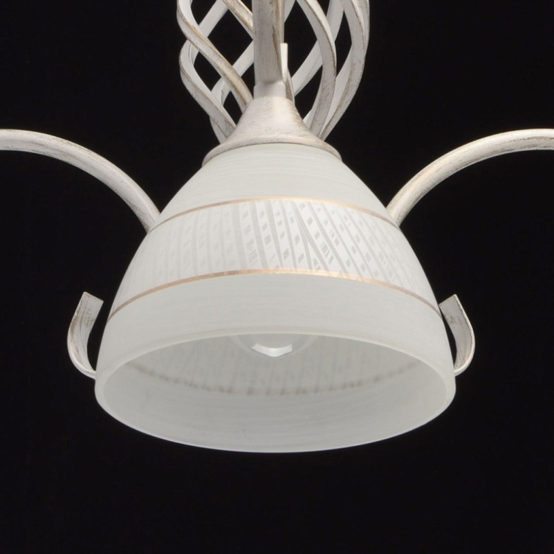 Основание: металл, окрашивание по технологии хай-лайт, защитный слой - белый цвет, декоративный слой золотого цвета нанесен сухой кистью . Плафоны: стекло, обработано по технологии матирования. На плафоны нанесен рисунок белой и золотой краской. Декор: центральная часть выполнена по технологии твист.