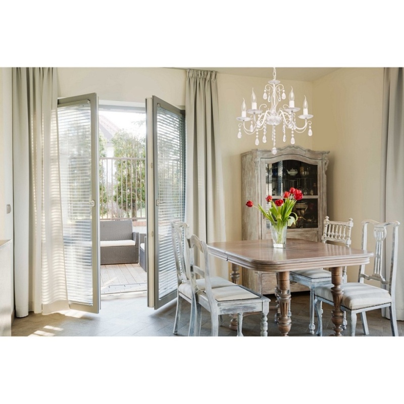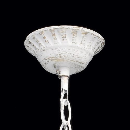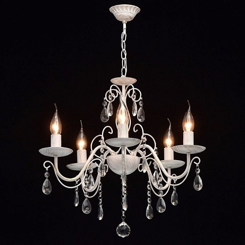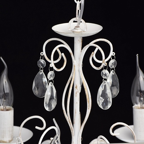 Основание светильника выполнена из металла и окрашена по технологии хай-лайт, основный слой - белый, декоративный слой - золотого цвета. Декор: подвески из декоративного стекла.