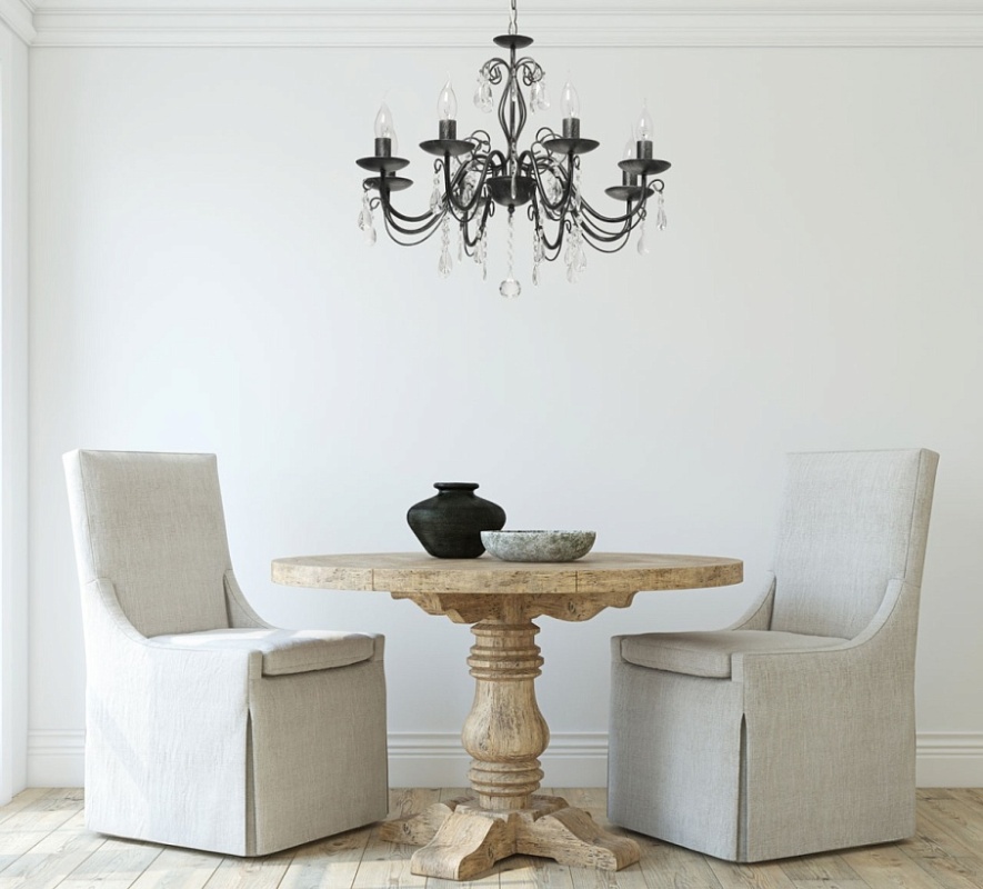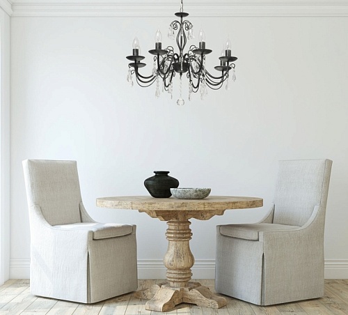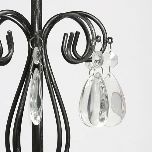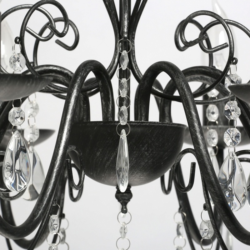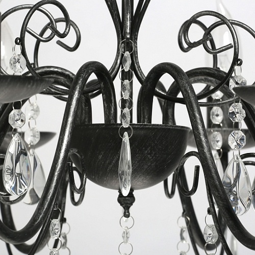 Основание светильника выполнено из металла и обработано по технологии хай-лайт, где основной слой черного цвета, а декоративный слой серебряного цвета. Светильник декорирован прозрачным хрусталем.
