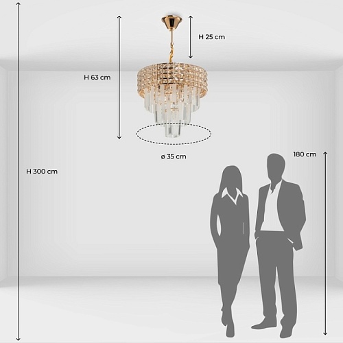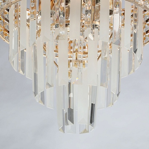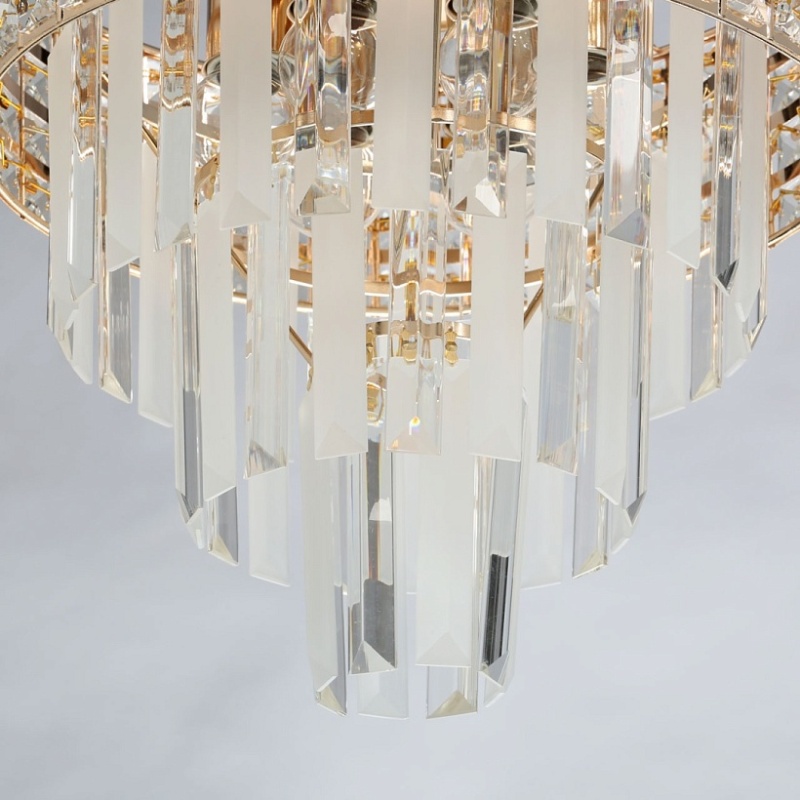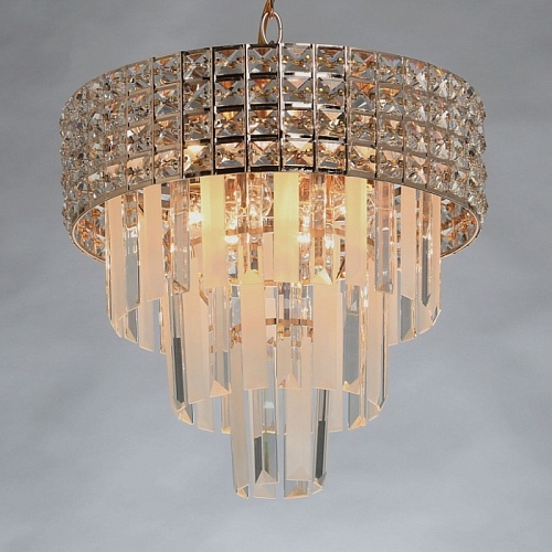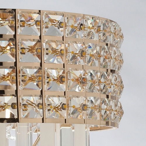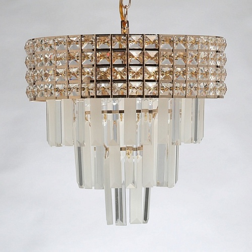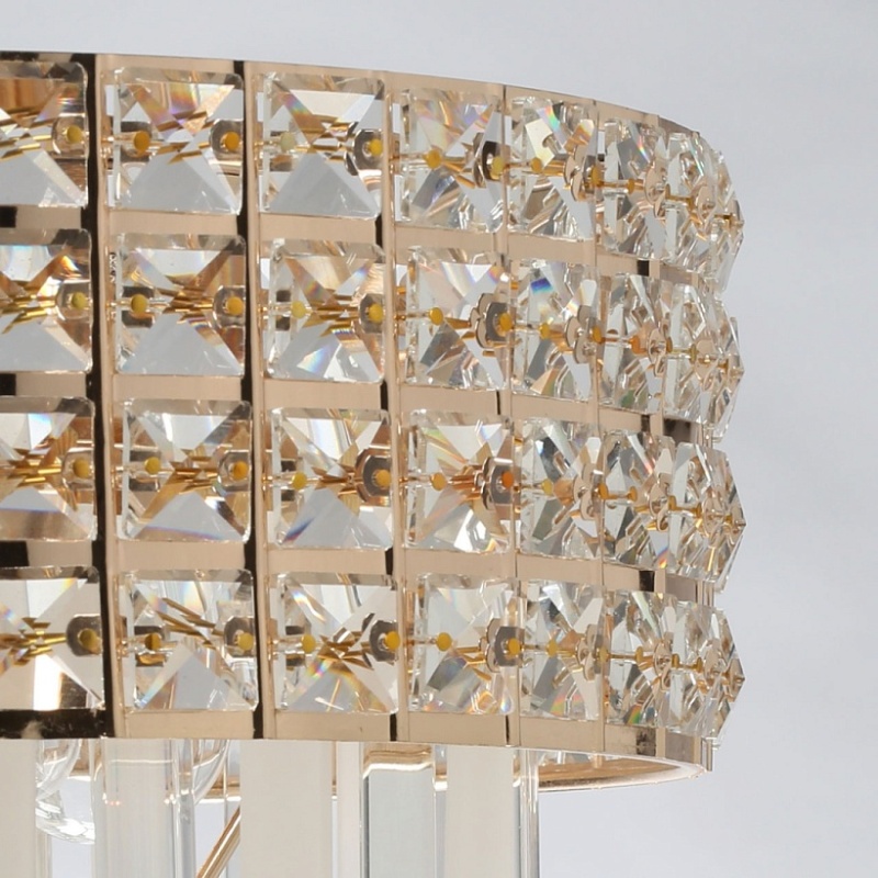 Металлическое основание светильника гальванизировано в цвет золота. Светильник декорирован прозрачным хрусталем прямоугольной и квадратной формы.