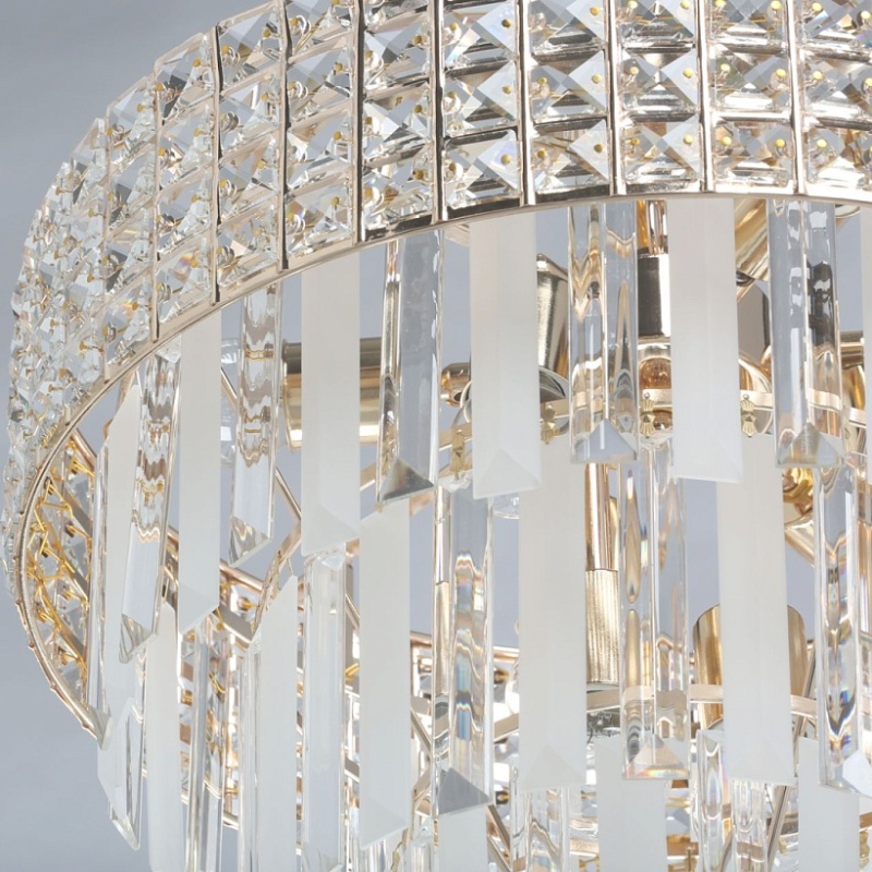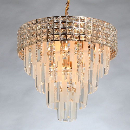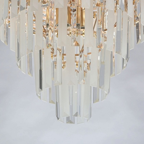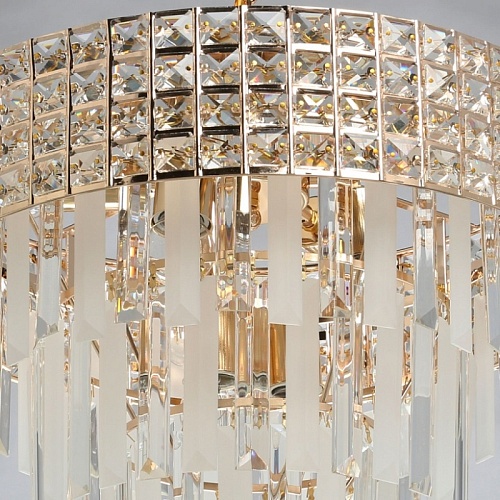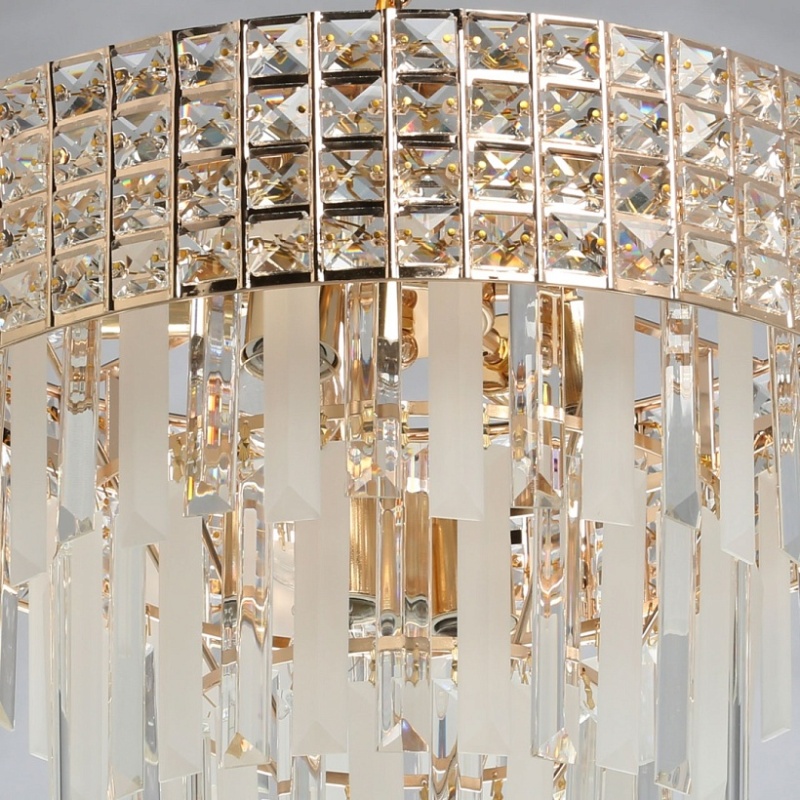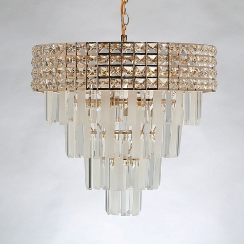 Металлическое основание светильника гальванизировано в цвет золота. Светильник декорирован прозрачным хрусталем прямоугольной и квадратной формы.