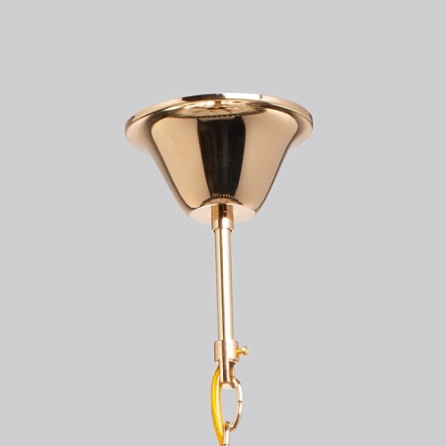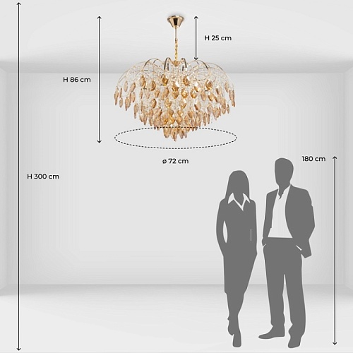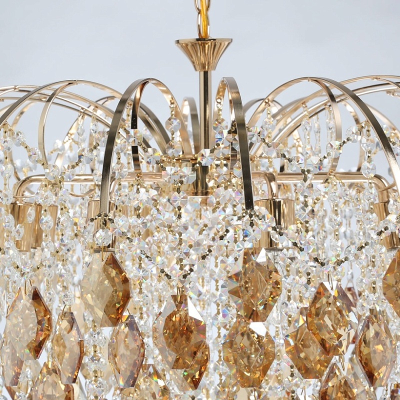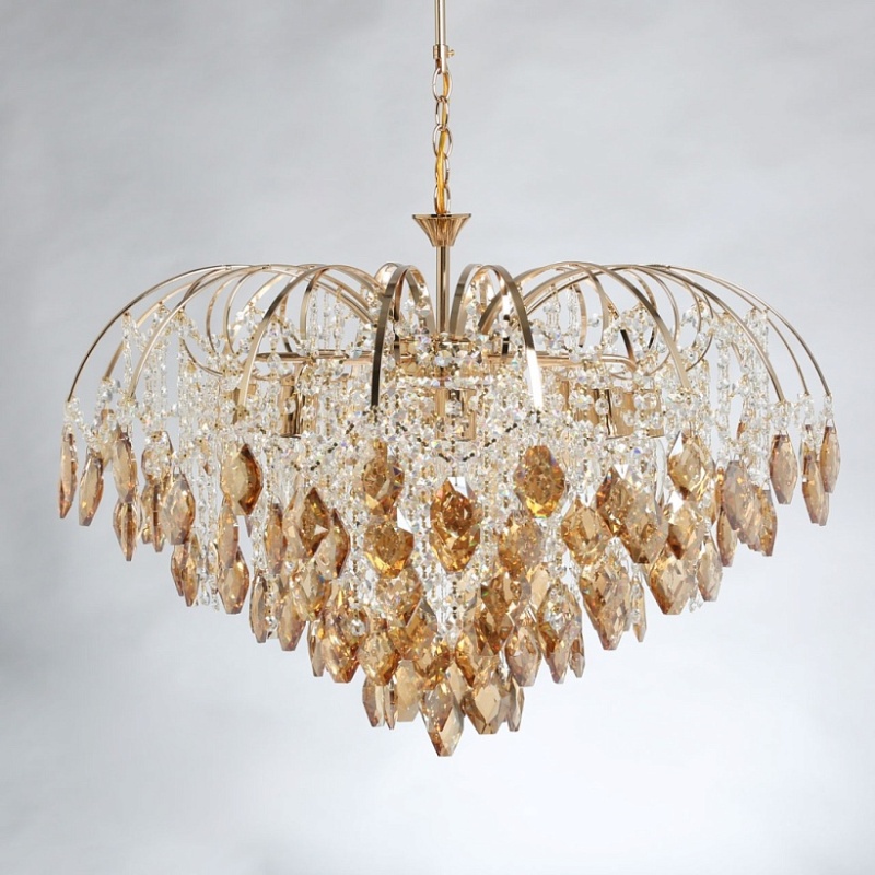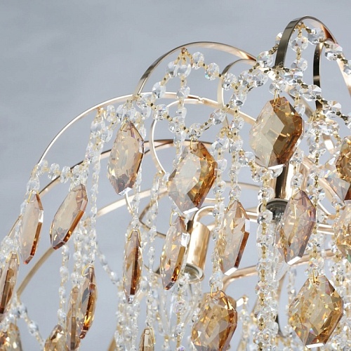 Металлическое основание гальванизировано в цвет золота. Светильник декорирован хрусталем в форме ромбов, гальванизированным в цвет янтаря и прозрачным хрусталем в форме октагонов.
