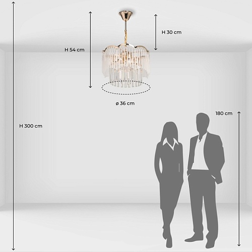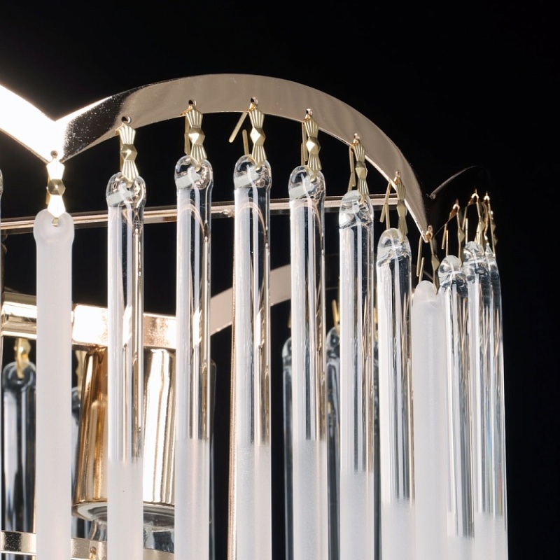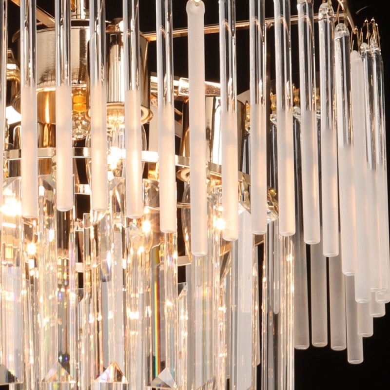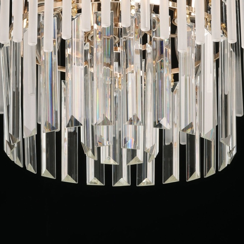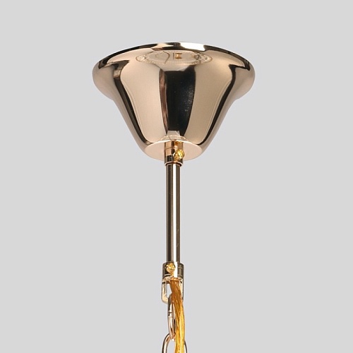 Металлическое основание подвесной люстры гальванизировано в цвет золота. Люстра декорирована подвесками из прозрачного стекла.