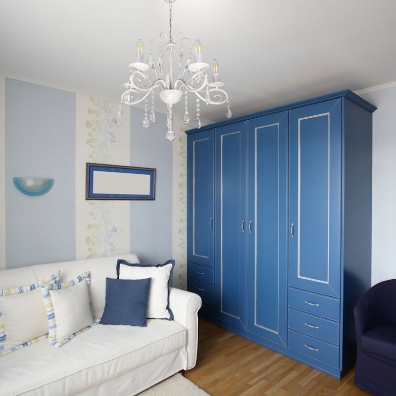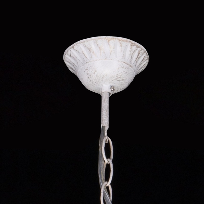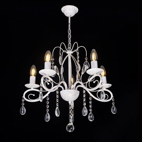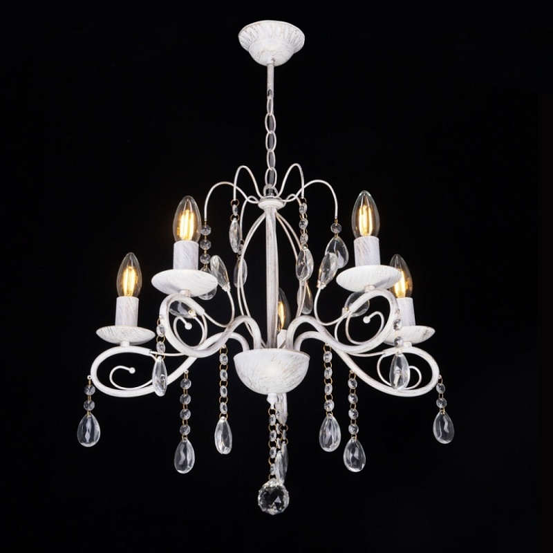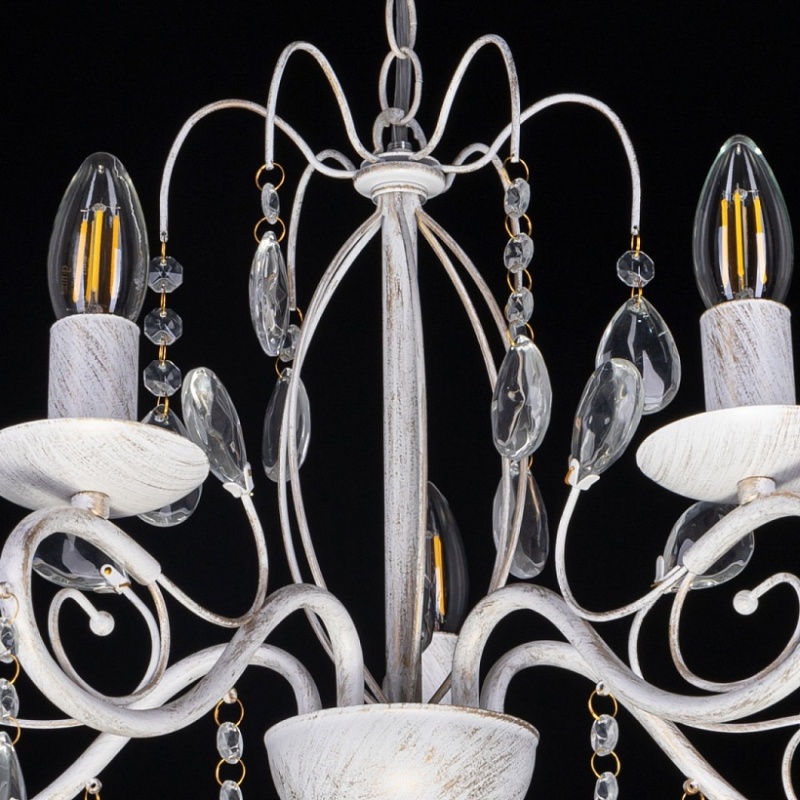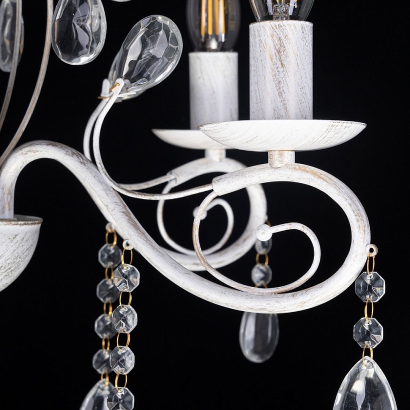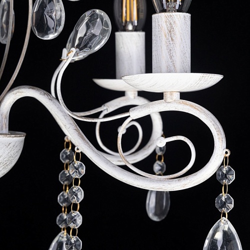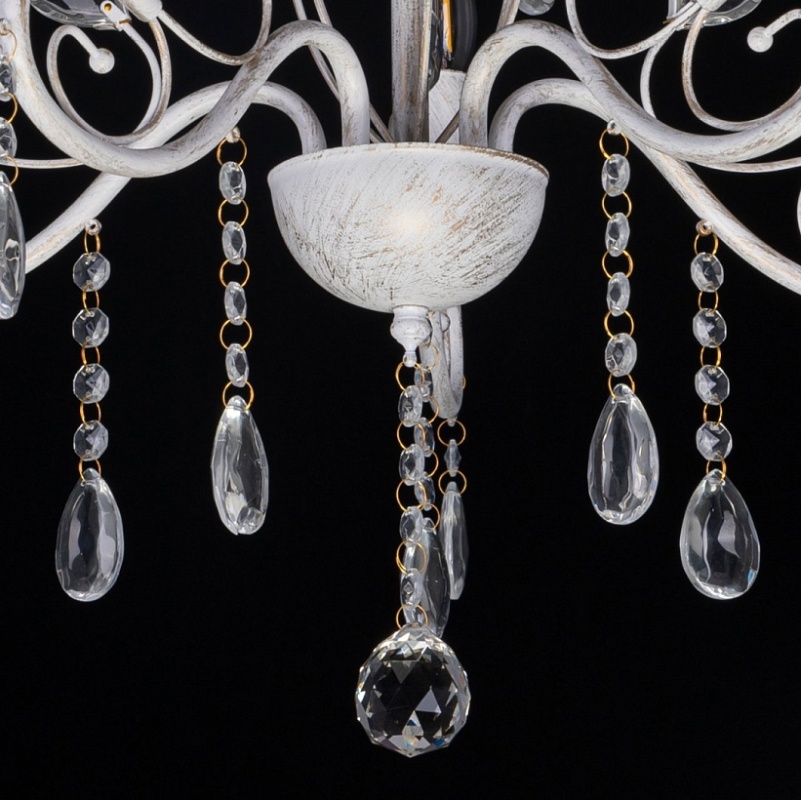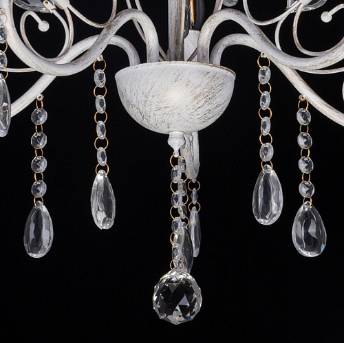 Металлическое основание светильника окрашено в белый цвет и обработано по технологии хай-лайт в золотой цвет. Светильник декорирован стеклянными подвесами миндалевидной формы и хрусталем в форме шара.