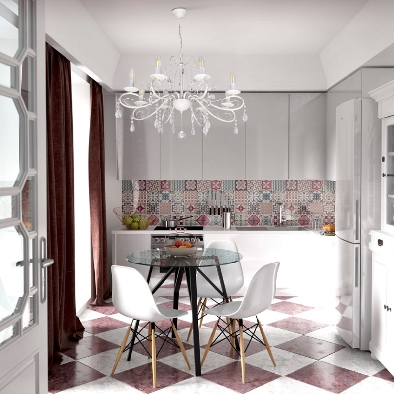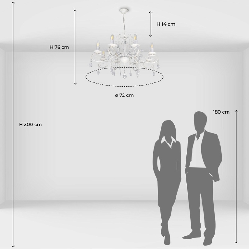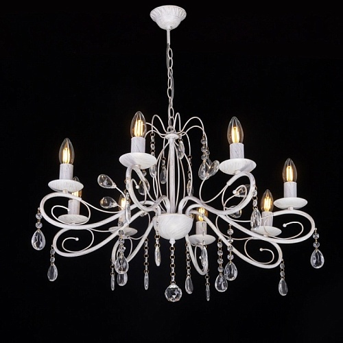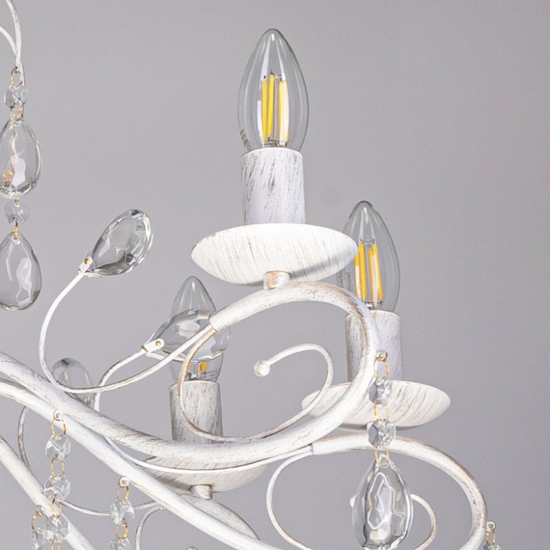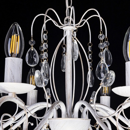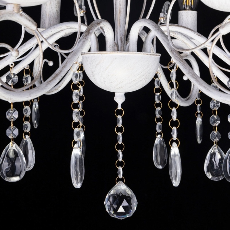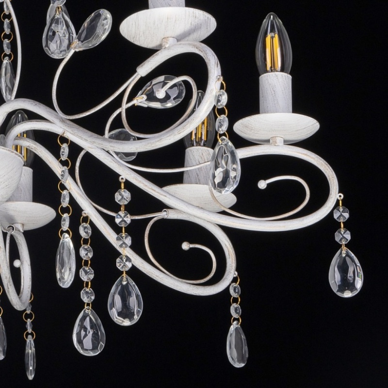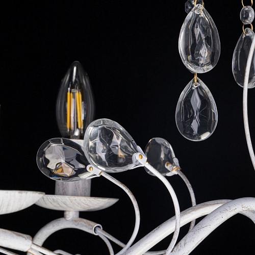 Металлическое основание светильника окрашено в белый цвет и обработано по технологии хай-лайт в золотой цвет. Светильник декорирован стеклянными подвесами миндалевидной формы и хрусталем в форме шара.