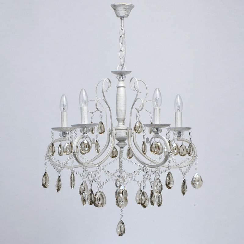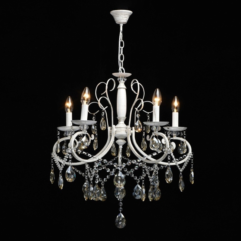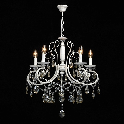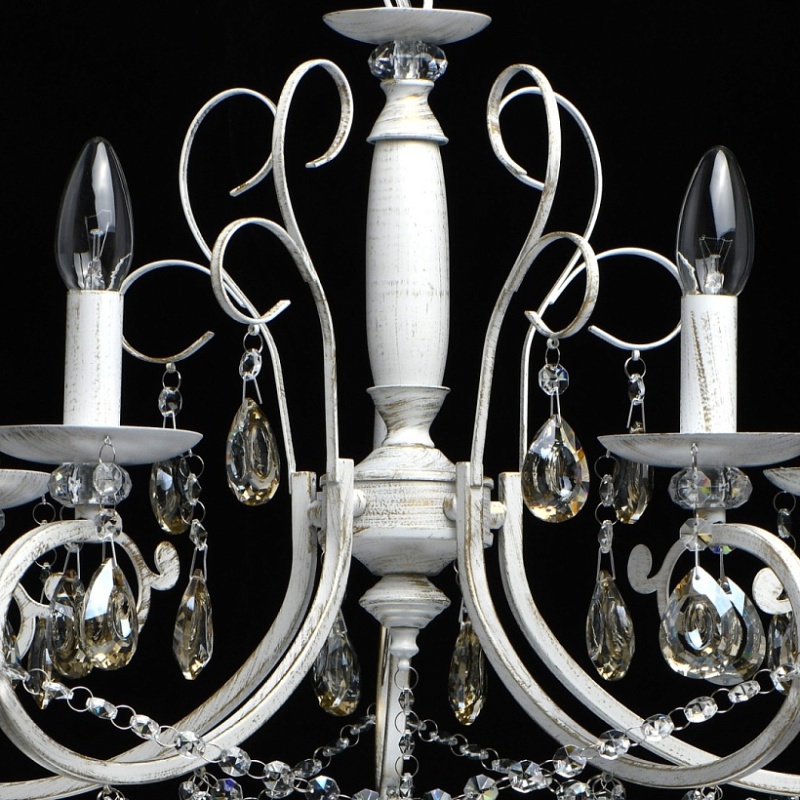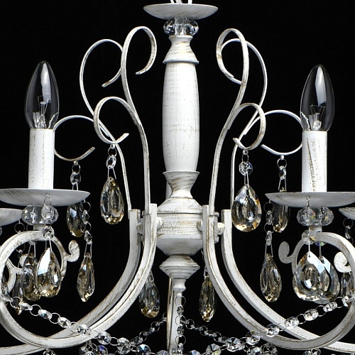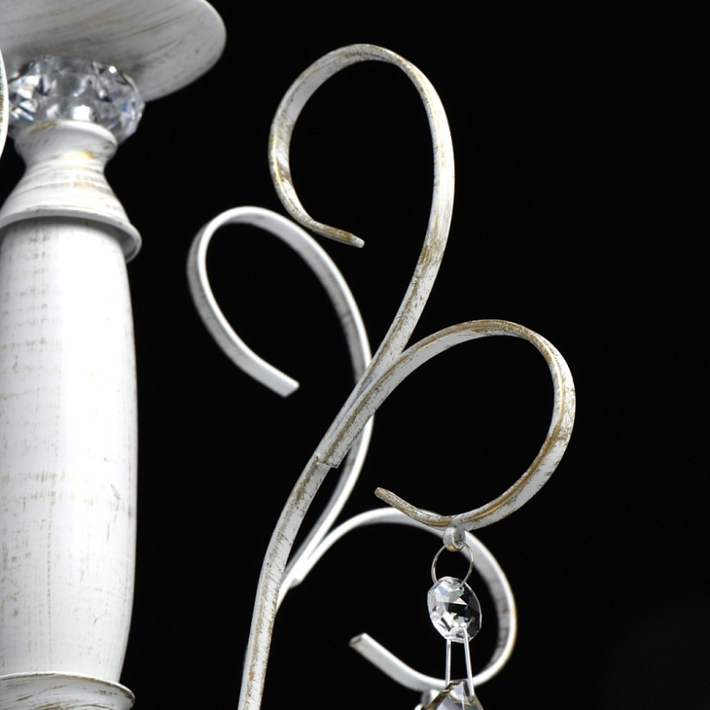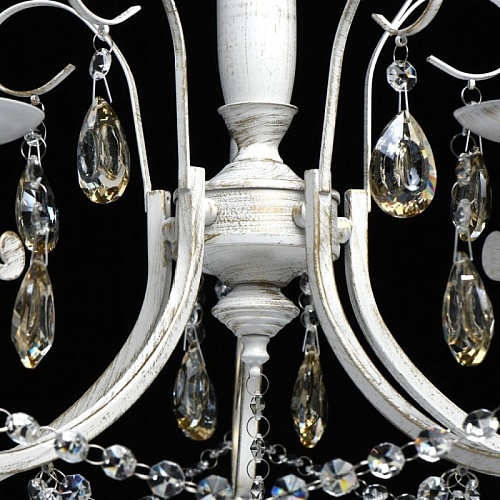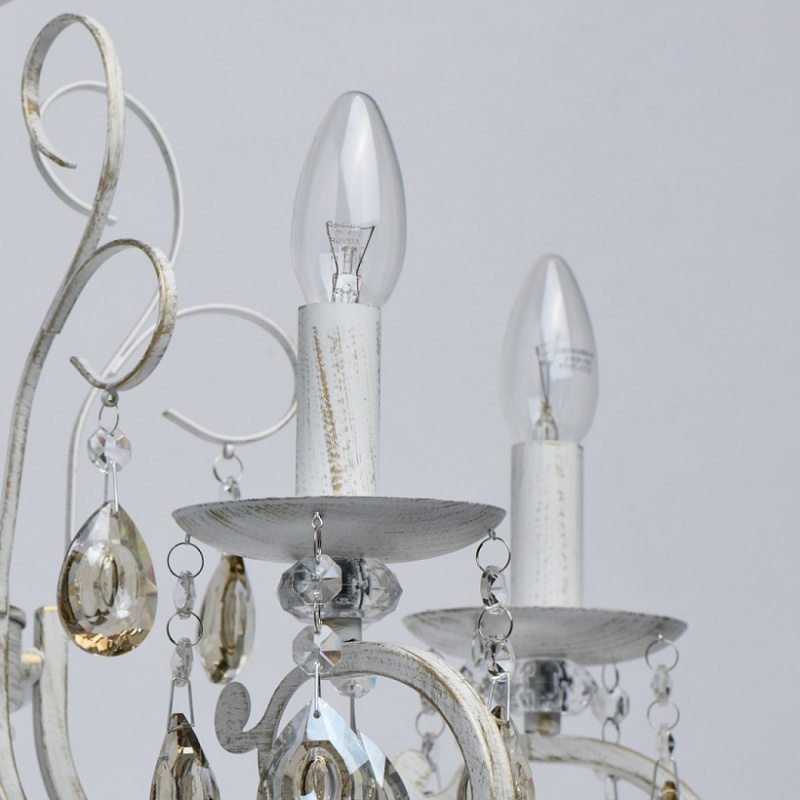 Основание светильника выполнено из металла и обработано по технологии хай-лайт, где основной слой белого цвет, а декоративный - золотого. Светильник декорирован прозрачным хрусталем формы октагон и хрусталем формы миндаль, гальванизированным в цвет шампань.