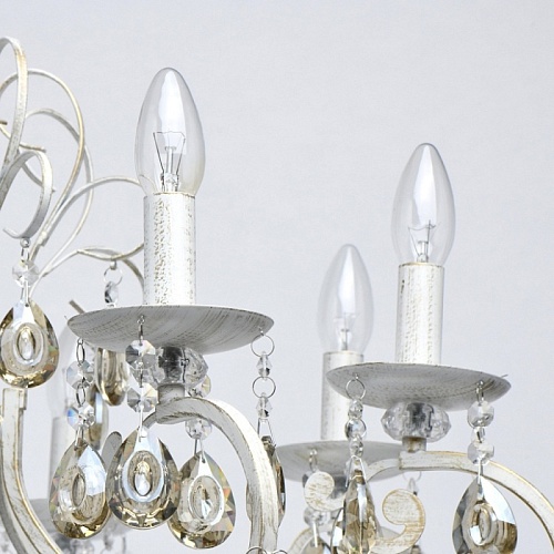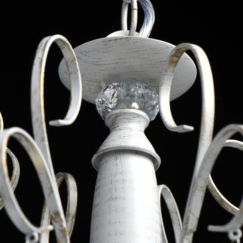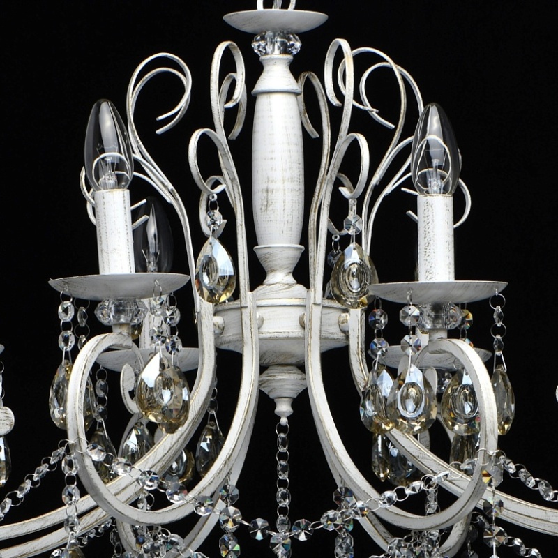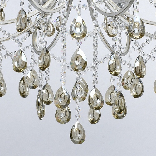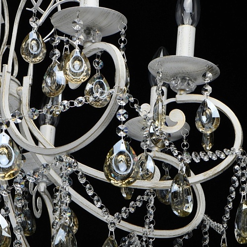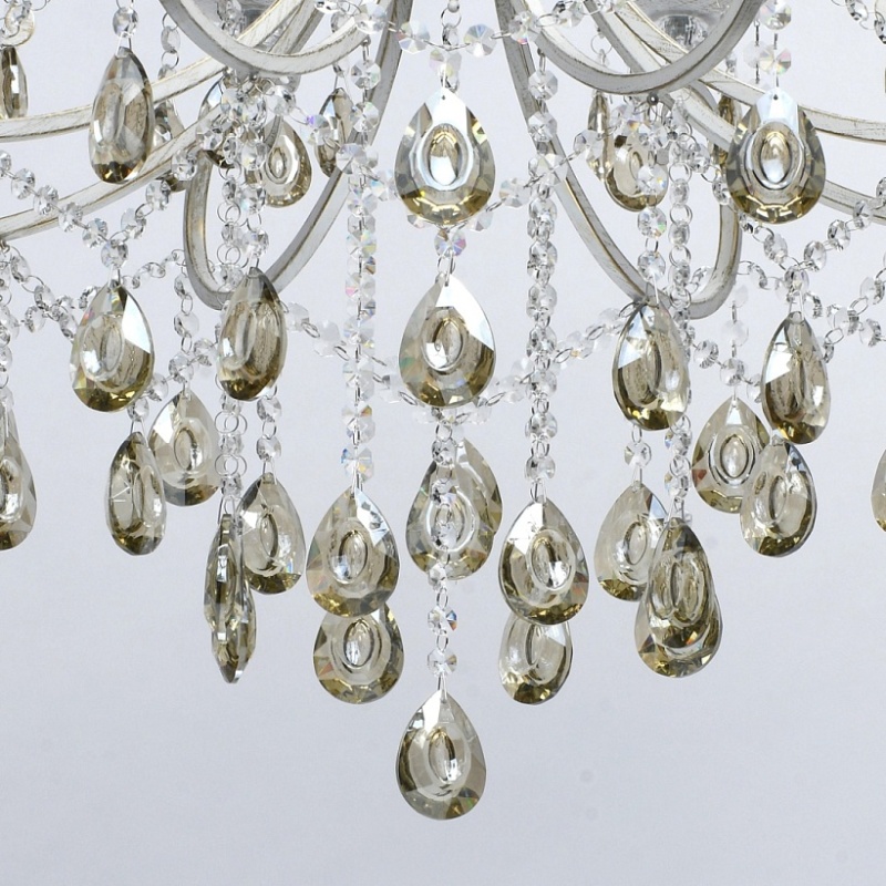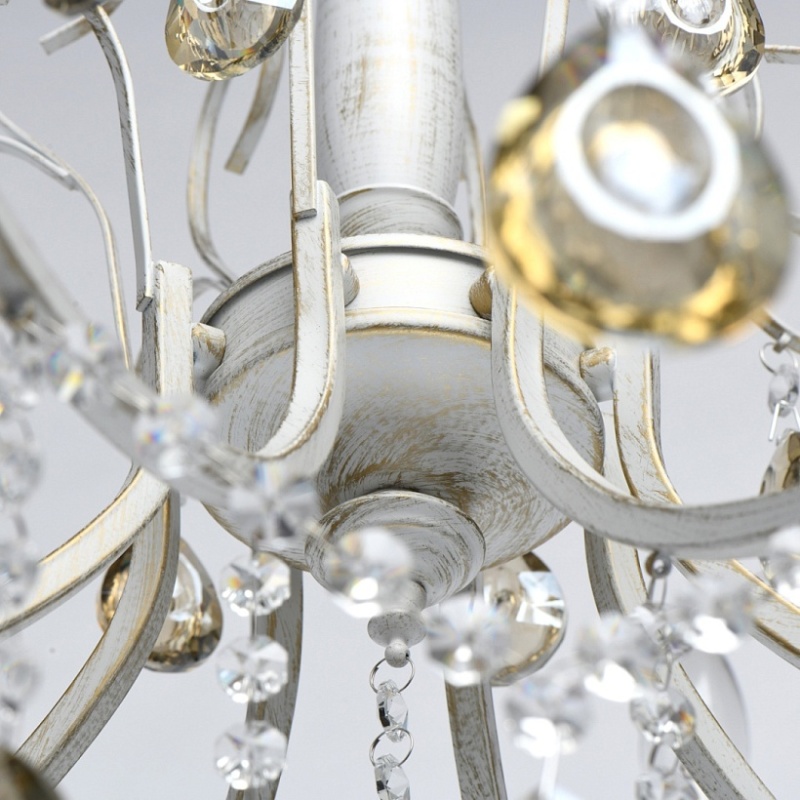 Основание светильника выполнено из металла и обработано по технологии хай-лайт, где основной слой белого цвет, а декоративный - золотого. Светильник декорирован прозрачным хрусталем формы октагон и хрусталем формы миндаль, гальванизированным в цвет шампань.