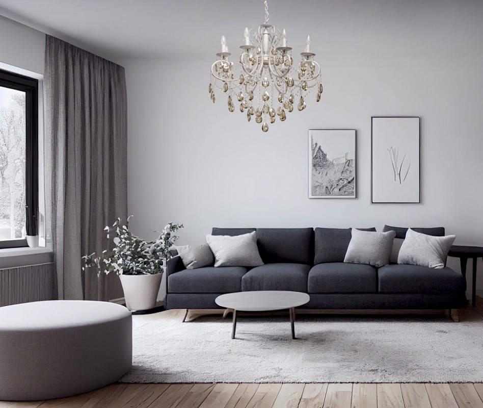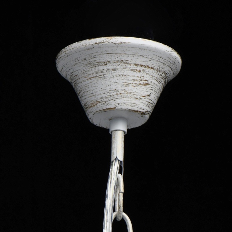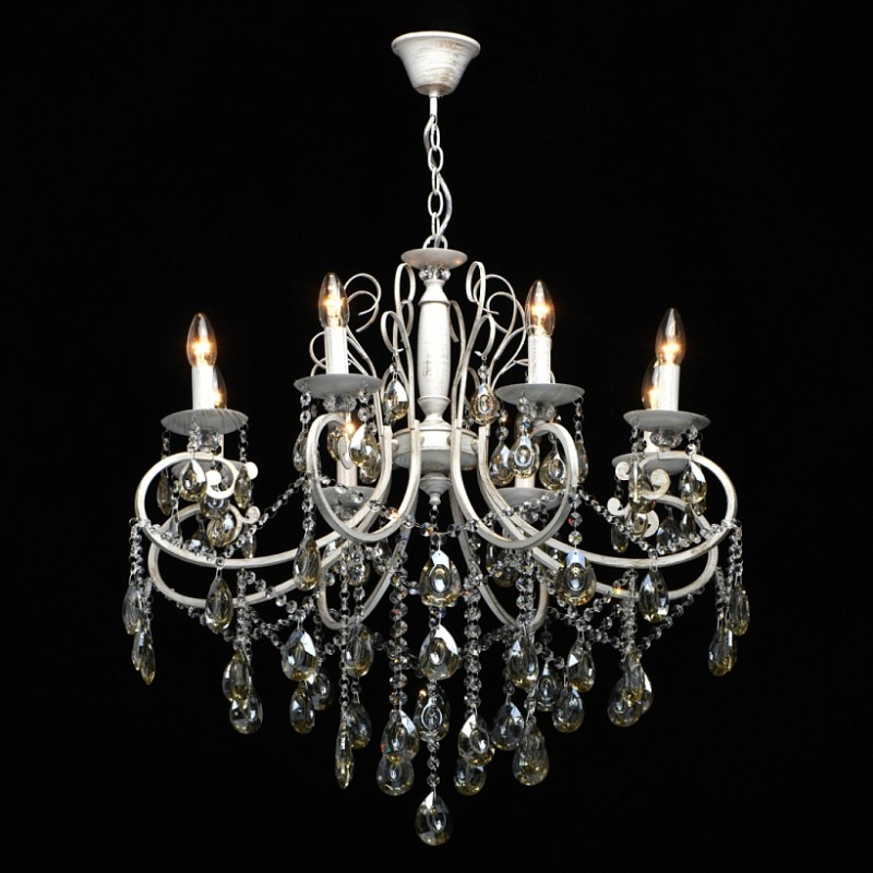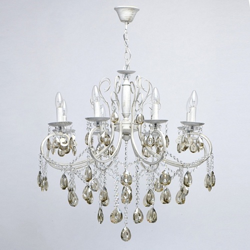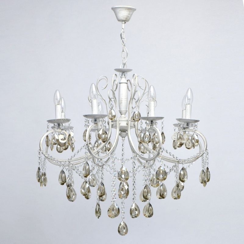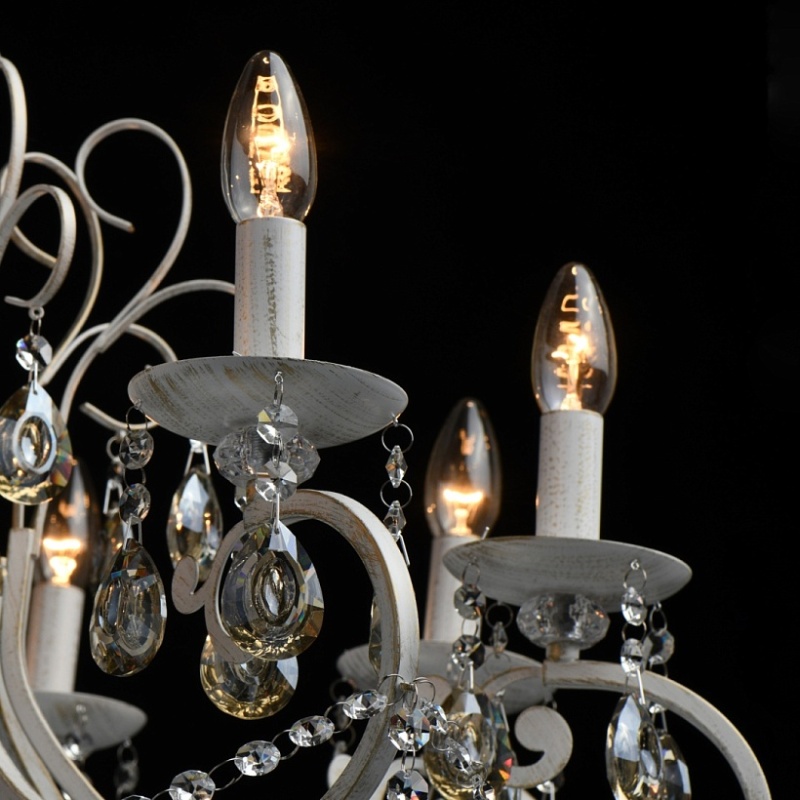 Основание светильника выполнено из металла и обработано по технологии хай-лайт, где основной слой белого цвет, а декоративный - золотого. Светильник декорирован прозрачным хрусталем формы октагон и хрусталем формы миндаль, гальванизированным в цвет шампань.