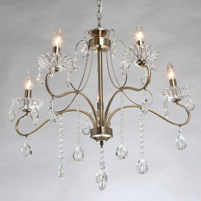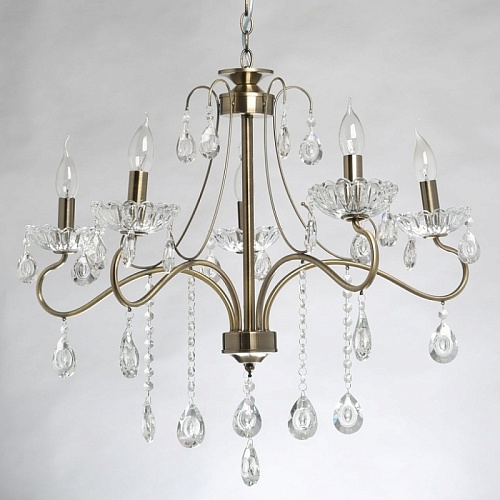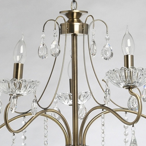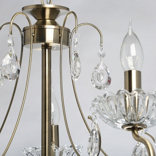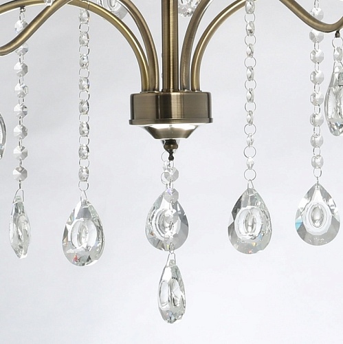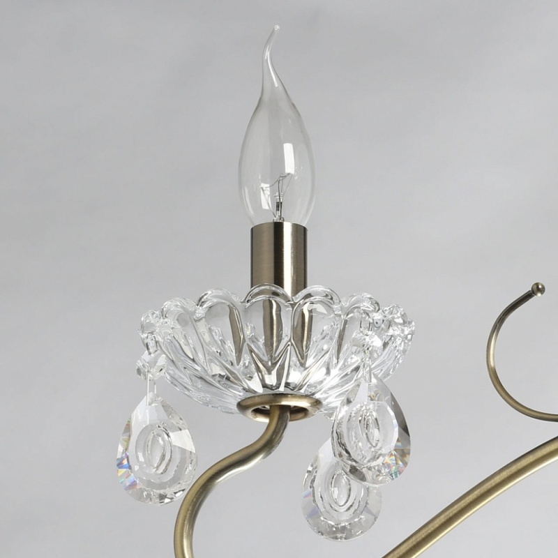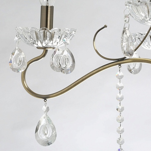 Металлическое основание гальванизировано в цвет античной бронзы. Декоративные розетки выполнены из стекла, отлитого в сложную форму. Светильник декорирован подвесками из хрустального стекла.