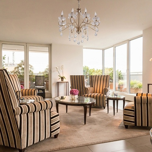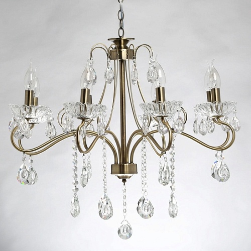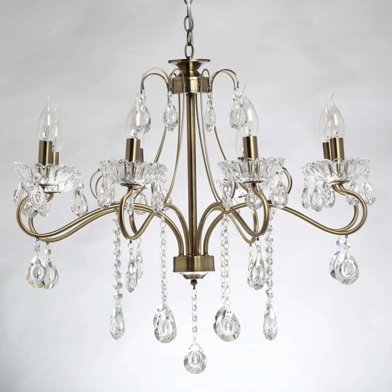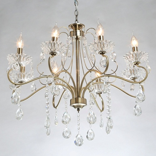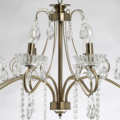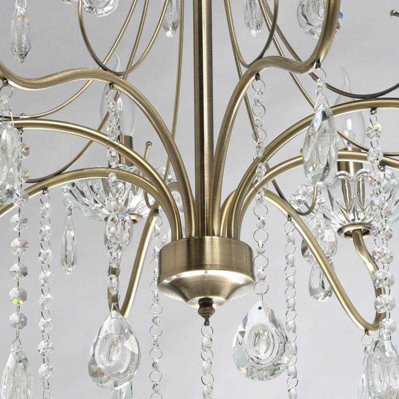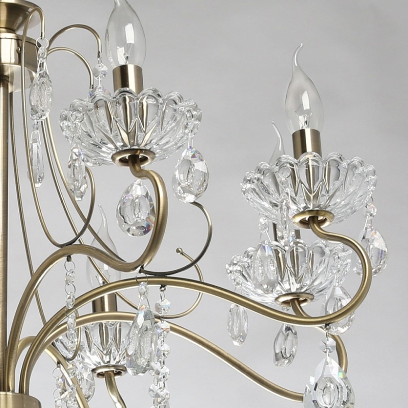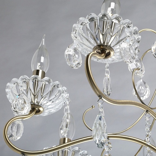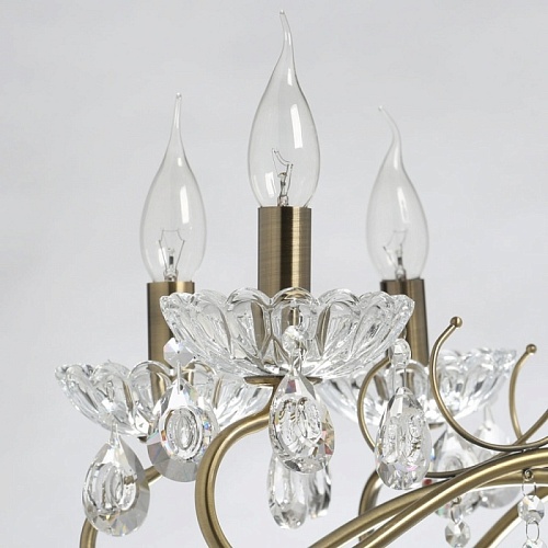 Металлическое основание гальванизировано в цвет античной бронзы. Декоративные розетки выполнены из стекла, отлитого в сложную форму. Светильник декорирован подвесками из хрустального стекла.