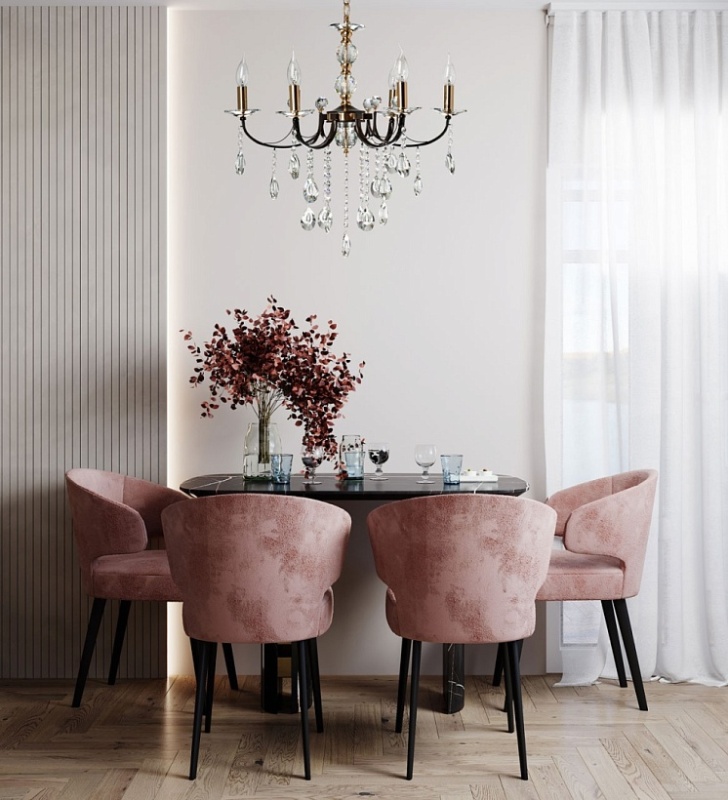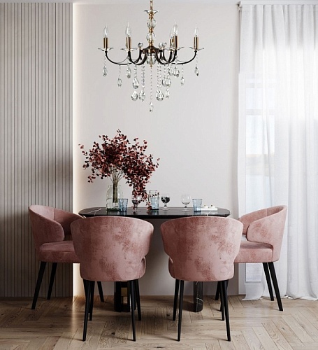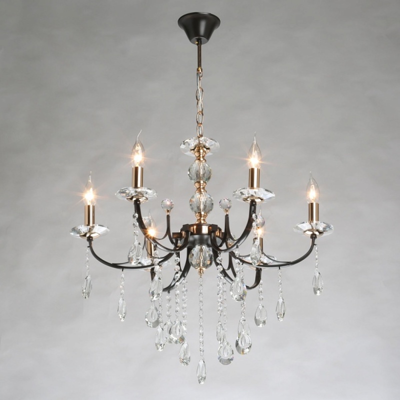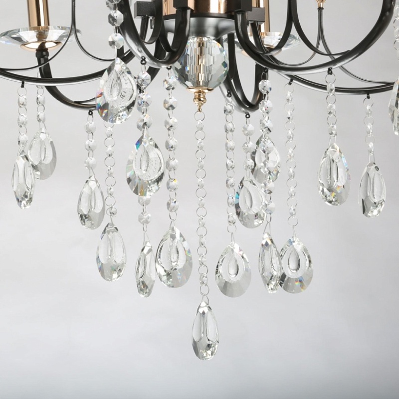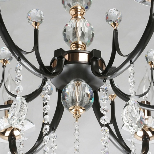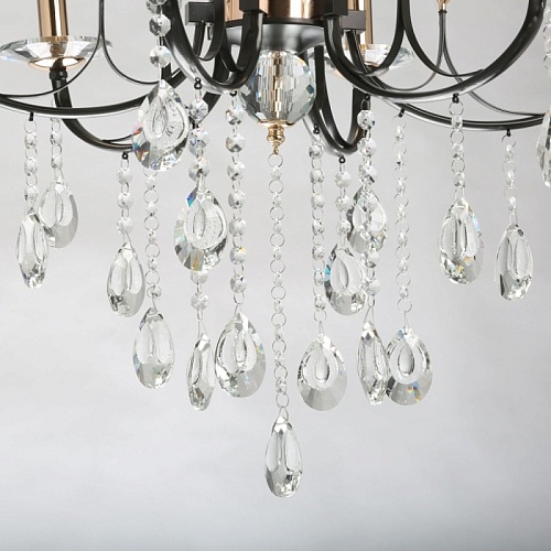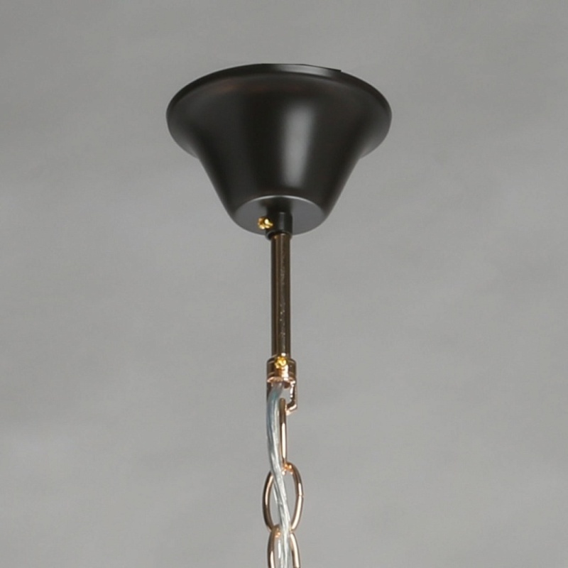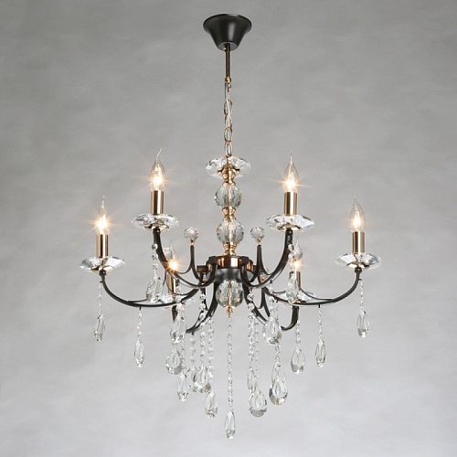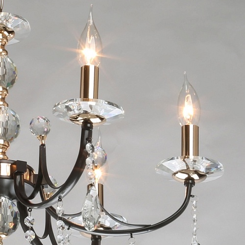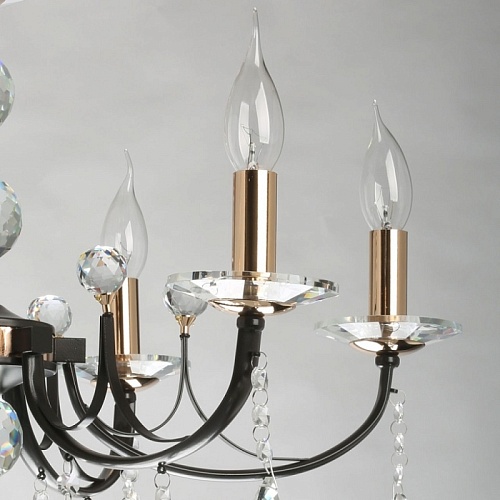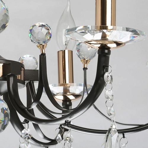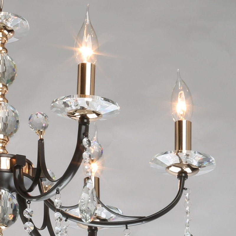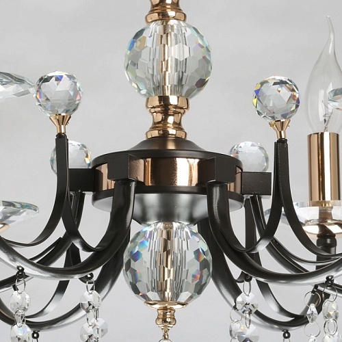 Металлическое основание подвесного светильника окрашено в цвет кофе. Отдельные элементы основания гальванизированы в цвет золота. Светильник декорирован прозрачным хрусталем.