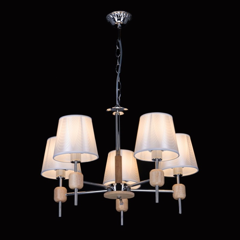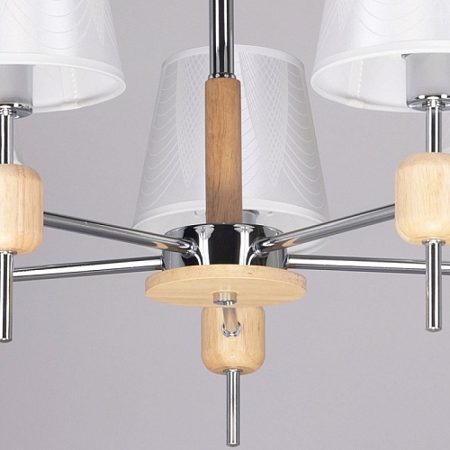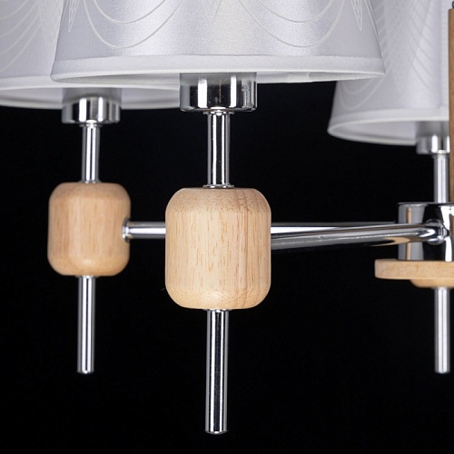 Металлическое основание светильника гальванизировано в цвет хрома. Светильник декорирован текстильными абажурами белого цвета с термостойким акрилом внутри. Подвесная люстра декорирована элементами из массива дерева натурального цвета.