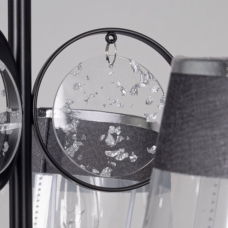 Металлическое основание подвесной люстры окрашено в черный цвет. Отдельные элементы основания гальванизированы в цвет хрома. Источники света закрыты текстильными абажурами с термостойким акрилом внутри. Текстиль абажуров в центре прозрачный, по краям черного цвета. Абажуры прошиты и отделаны кантом серебряного цвета. Подвесная люстра декорирована подвесками из акрила округлой формы.